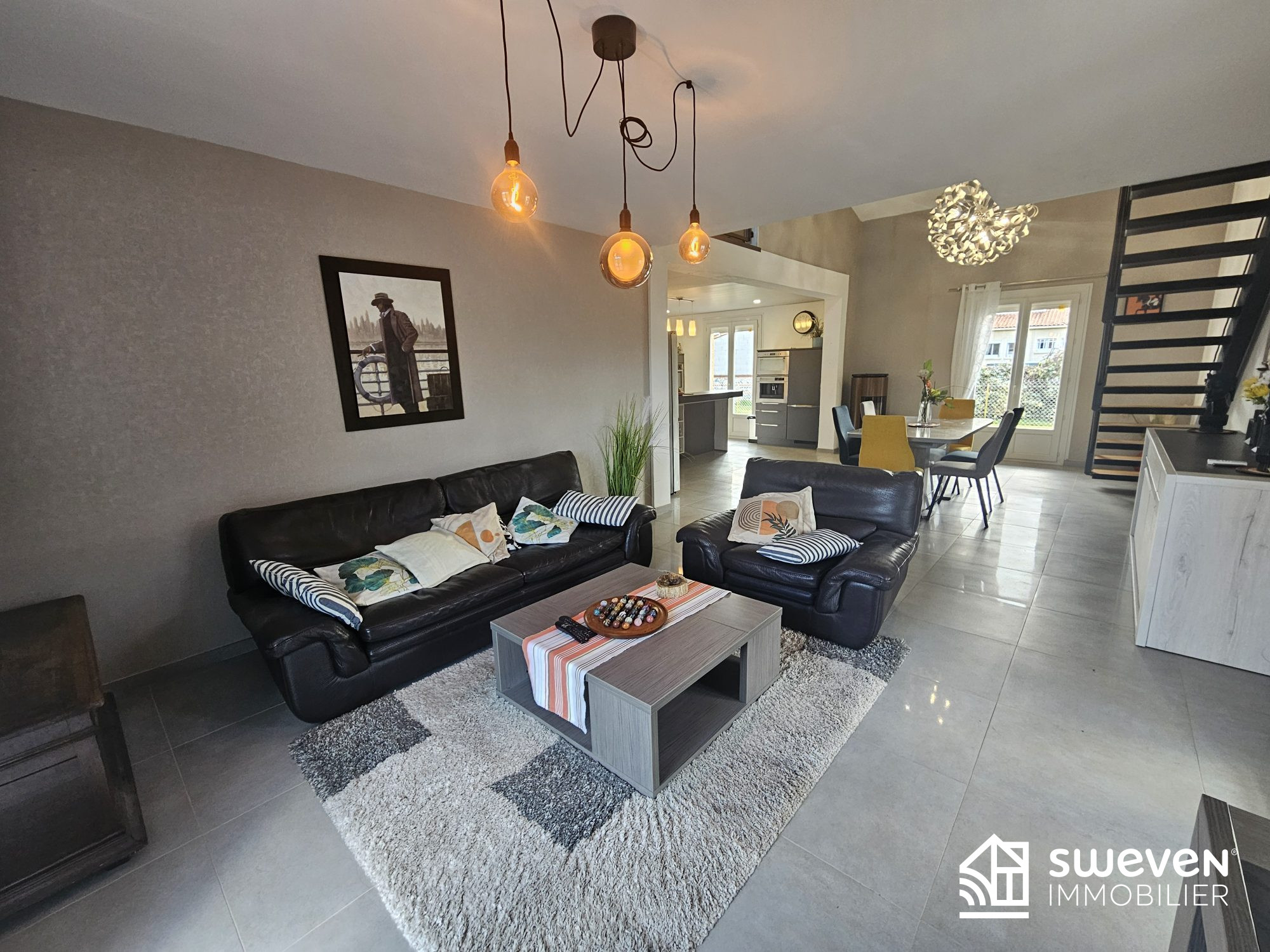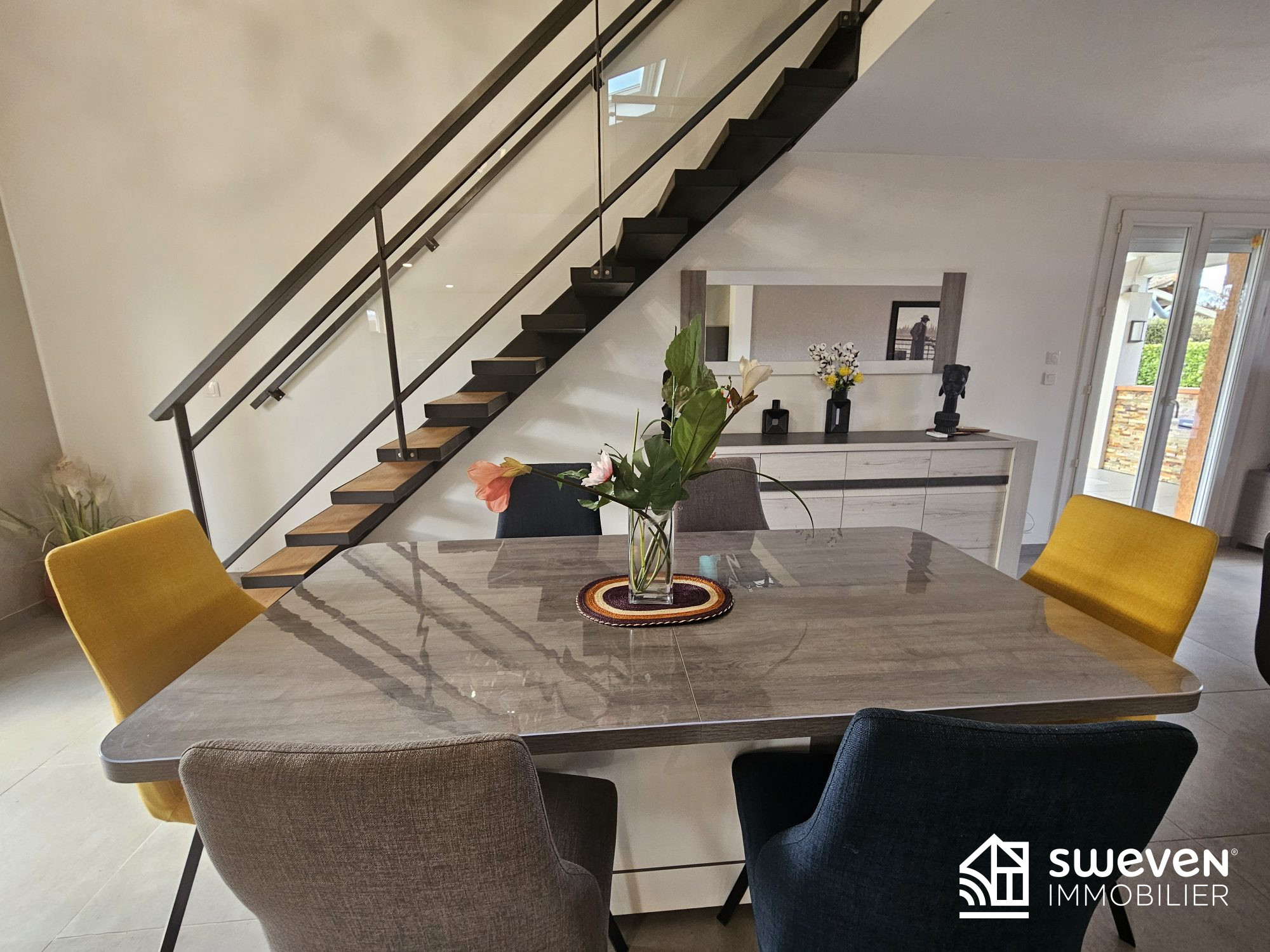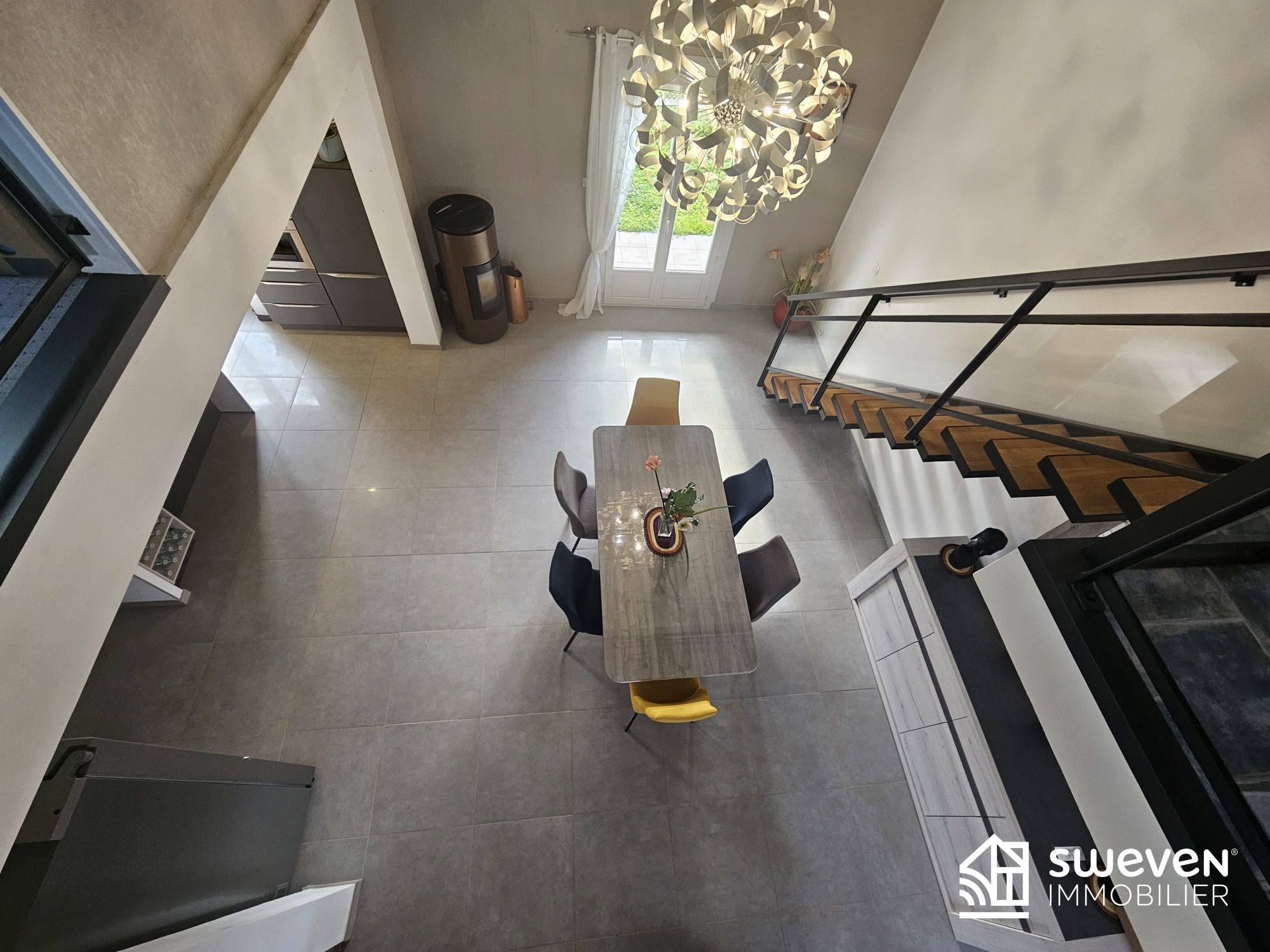 Au rez-de-chaussée, l'entrée dessert deux belles chambres de 13m2, une salle d'eau, un WC indépendant, et s'ouvre sur un bel espace de vie lumineux de 55m2 avec cuisine ouverte.