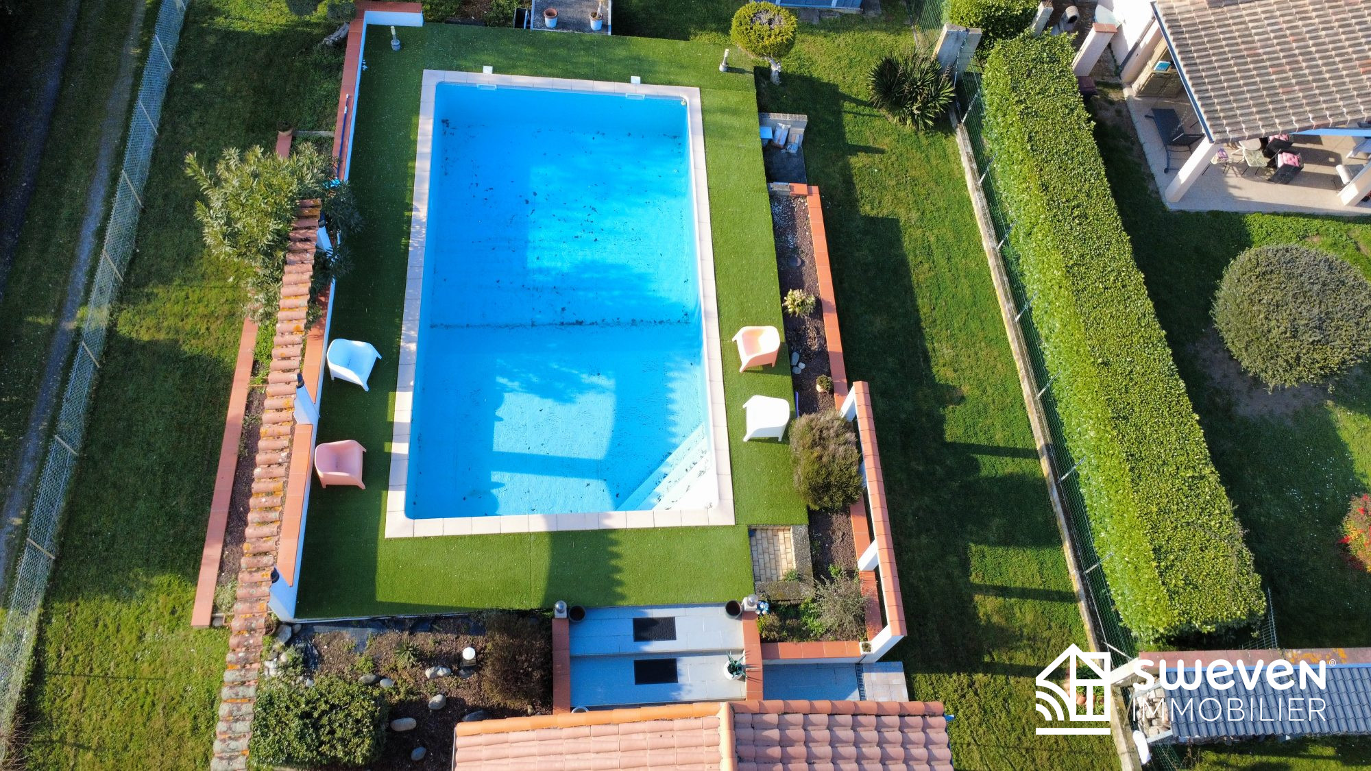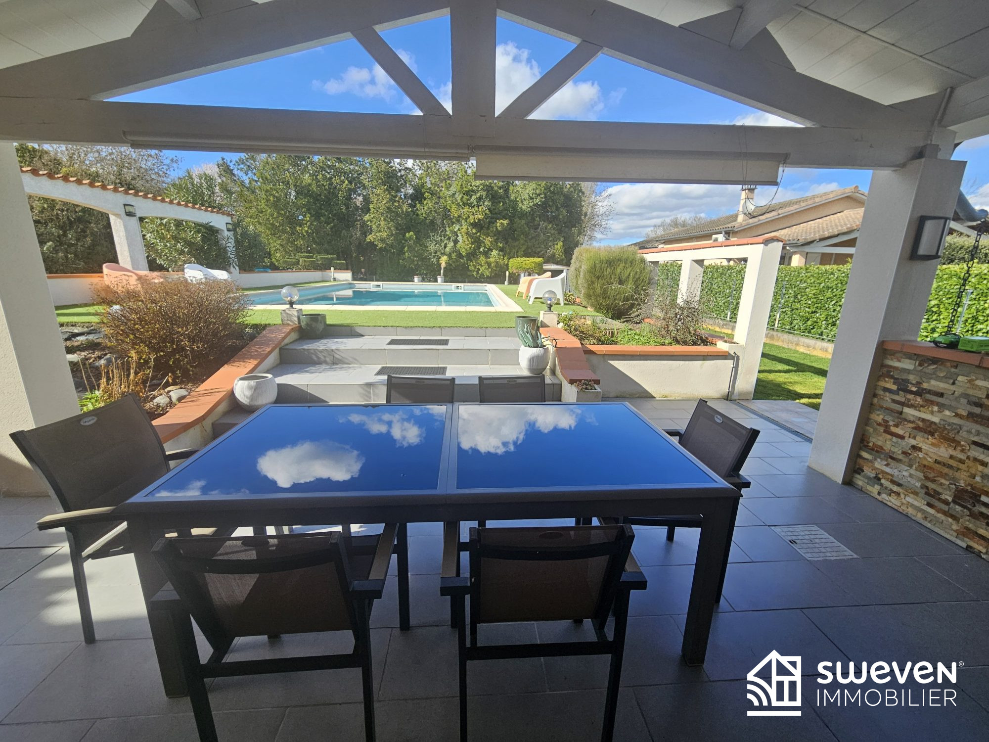 En été, vous pourrez profiter d'une belle terrasse couverte équipée d'un barbecue en dur et donnant sur une grande piscine de 10,5m x 5,5m.