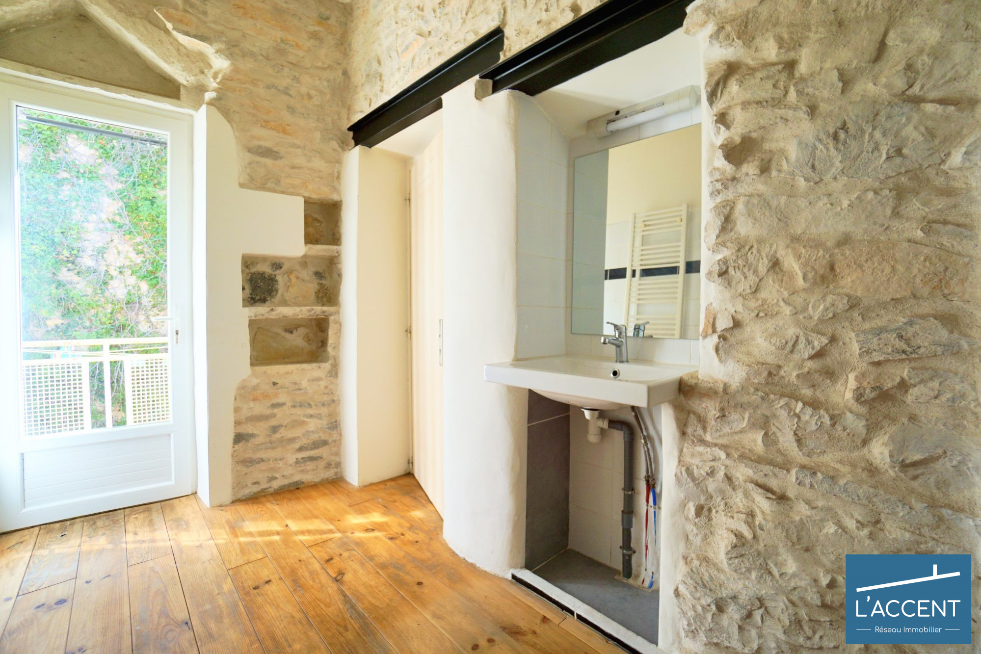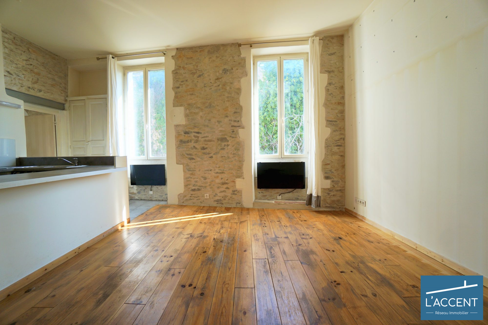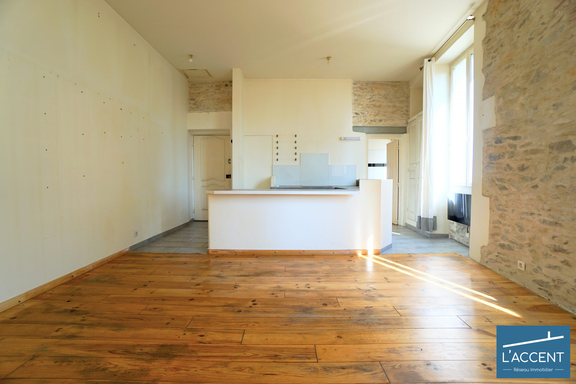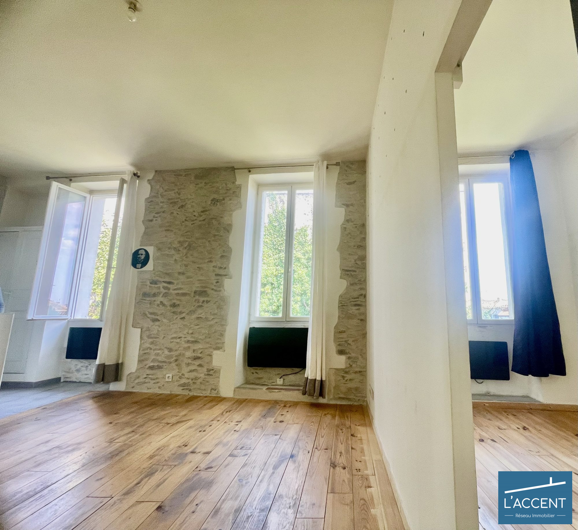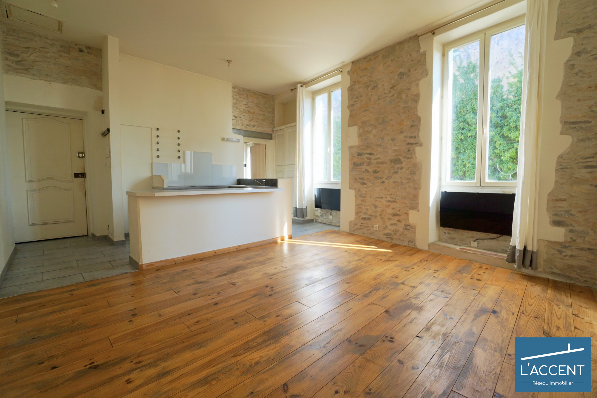 Un immense séjour de 26 m² baigné de lumière, une chambre cosy, et surtout… des murs en pierre jusqu'au plafond ! 3.20 de hauteur de plafond.