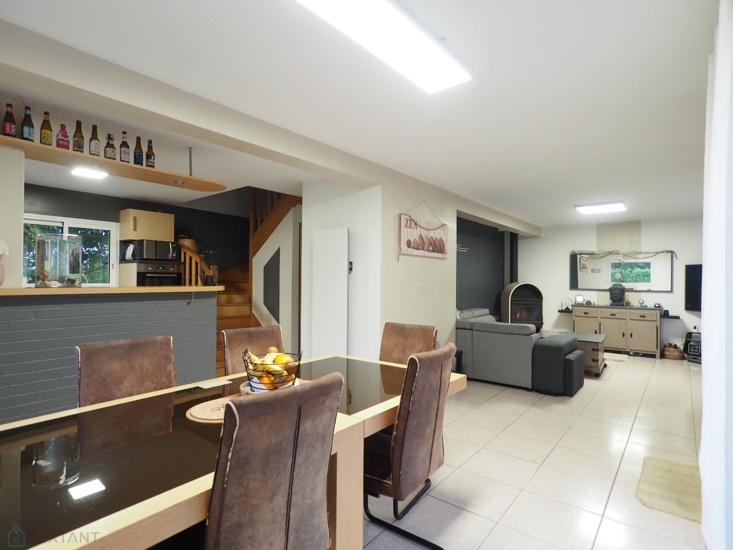 Une maison à Pluvigner A l'abri des regards, au fond d'un jardin joliment végétalisé et entretenu de 874 m², une accueillante et lumineuse maison sur sous-sol complet. Un cadre tranquille et bienveillant proche des commodités, services et écoles. Une agréable vie de plain-pied avec son entrée donnant sur une pièce de vie avec poêle à bois côté salon et cuisine A/E ouverte sur le côté dinatoire. Une suite parentale avec sa salle d'eau privative, un wc. A l'étage, un palier dessert deux grandes chambres, une plus petite ou bureau. Une SDB avec wc. Au sous-sol, un espace buanderie, un double garage avec portes automatiques, un espace atelier ou stockage. A l'extérieur, une terrasse au Sud et à l'Ouest, de beaux accès bitumés pour le confort de vie viennent apporter une touche un peu graphique à la propriété. Une jolie découverte à visiter sans tarder ! 15 minutes d'Auray et sa Gare TGV. 30 minutes de Vannes et de l'Océan. Honoraires : 3,24 % TTC inclus charge acquéreur (339 000 € hors honoraires) Agent commercial