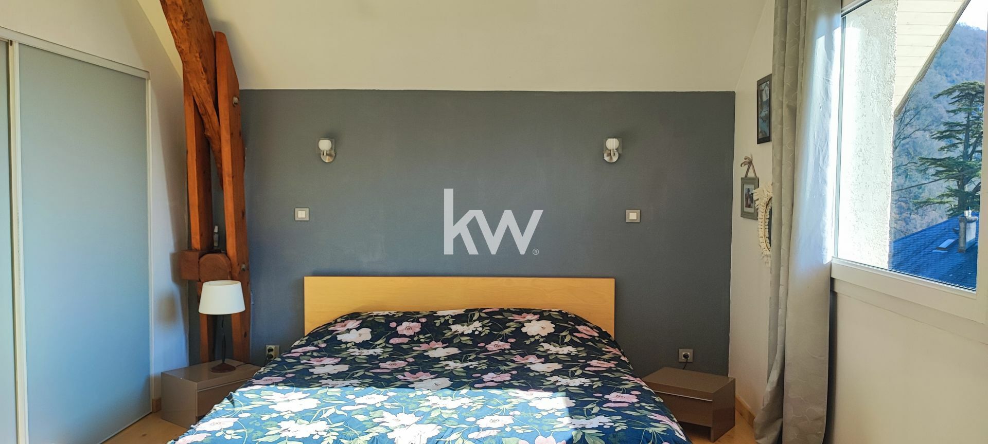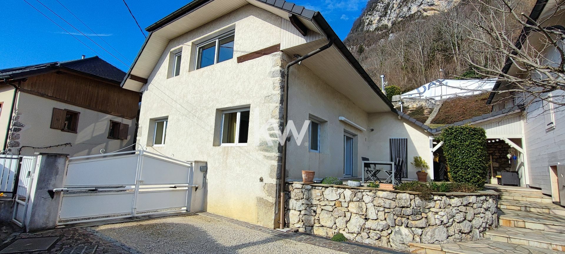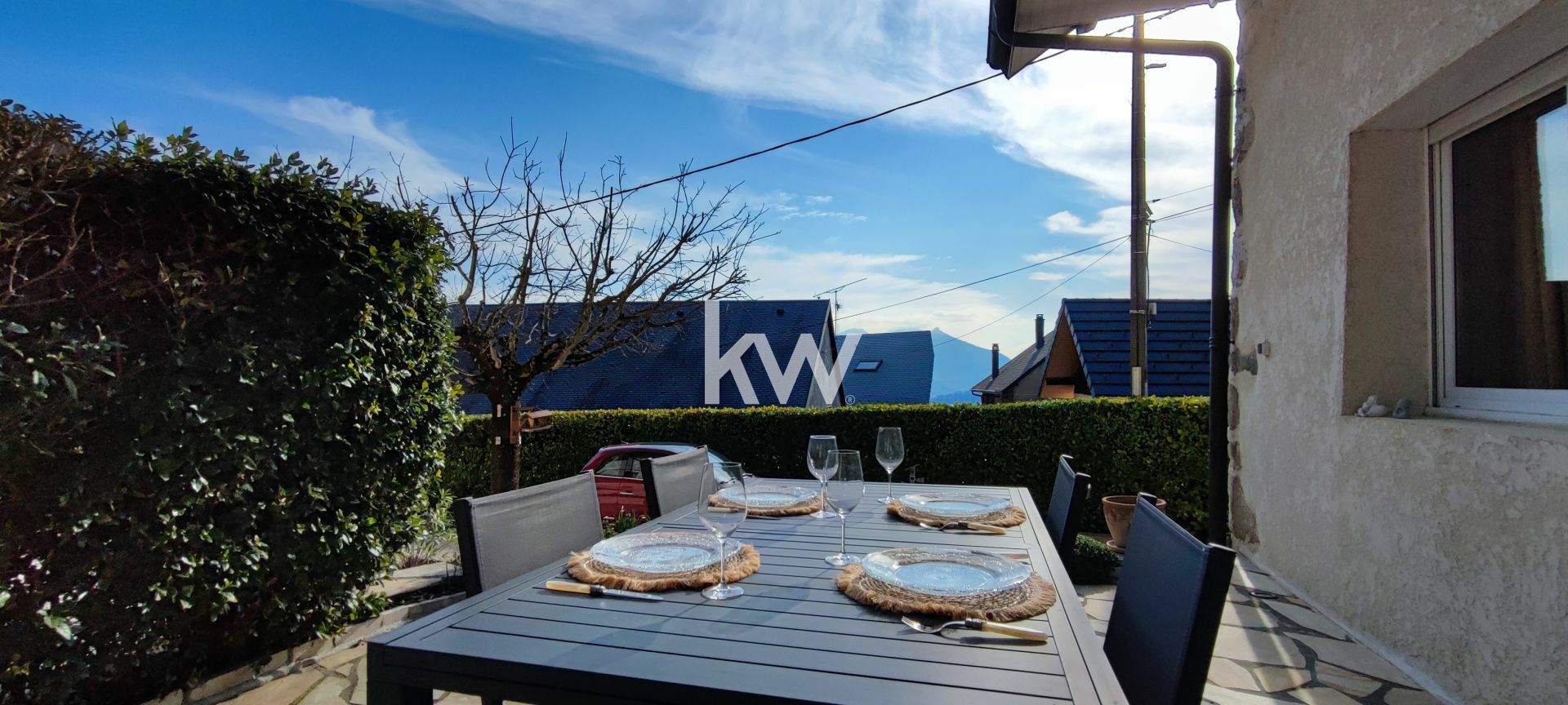 Édifiée sur une parcelle arborée et clôturée de 2 800 m², la maison offre une vue imprenable sur les massifs environnants, du Mont Granier à la chaîne des Belledonne.