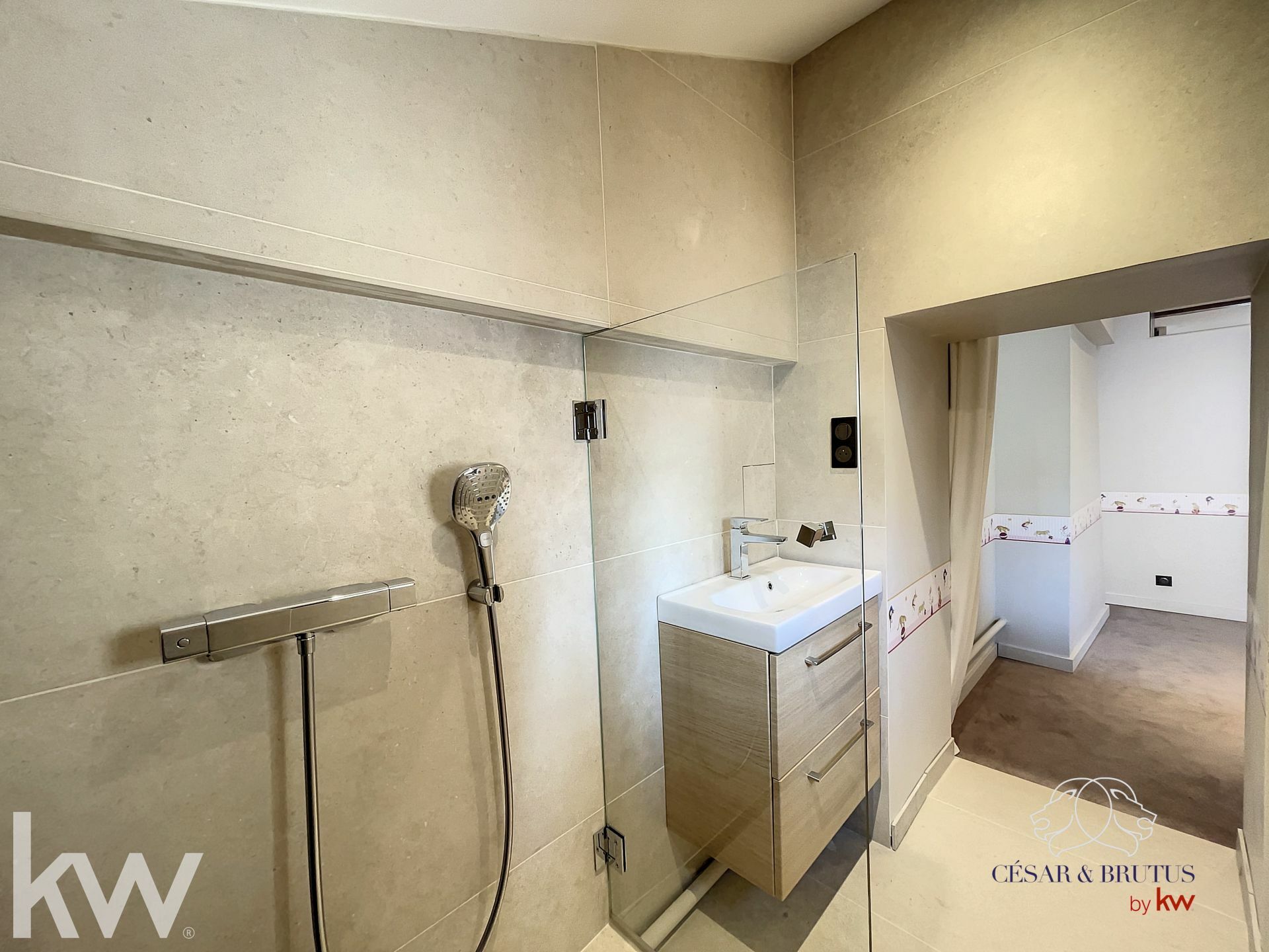 1 suite (coté cour) avec placard mural encastré toute hauteur sur mesure et sa superbe salle de bains.