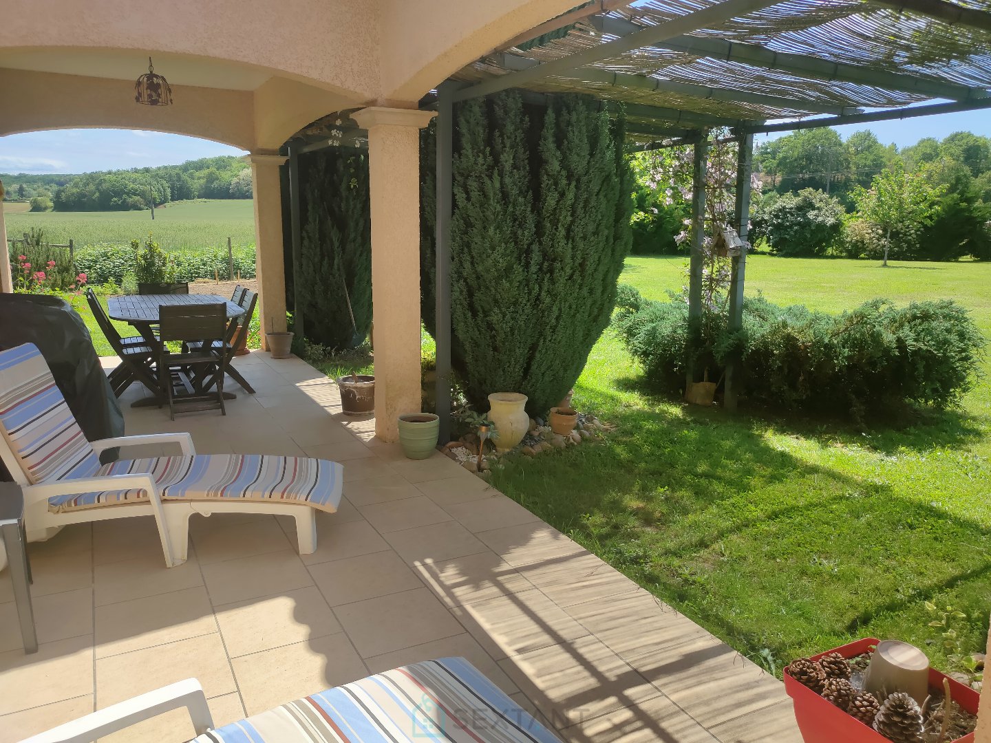DORDOGNE. PERIGORD. Entre BERGERAC et LALINDE, VALLEE de la DORDOGNE Description : Découvrez cette vaste maison de plain pied offrant un espace de vie généreux de plus de 70 m², incluant cuisine, séjour et salon. La maison donne sur une terrasse avec puits de lumière orientée plein Sud, idéale pour profiter du soleil et du joli parc arboré, piscinable. Sans vis-à-vis Caractérisitques : Grande suite parentale avec vrai dressing Chambre supplémentaire de belle taille avec salle d'eau Possibilité de créer une 3ème chambre facilement Garage Clôturé Atouts : Lumineuse, facile à vivre Environnment de qualité : proximité Voie Verte, village avec commerces de qualité, école. A visiter rapidement ! Honoraires : 4,17 % TTC inclus charge acquéreur (360 000 € hors honoraires) Agent commercial Sextant France - Anne Roger agent basé à FANLAC - 06 88 39 58 96 - Plus d'informations sur www.sextantfrance.fr réf. 23883