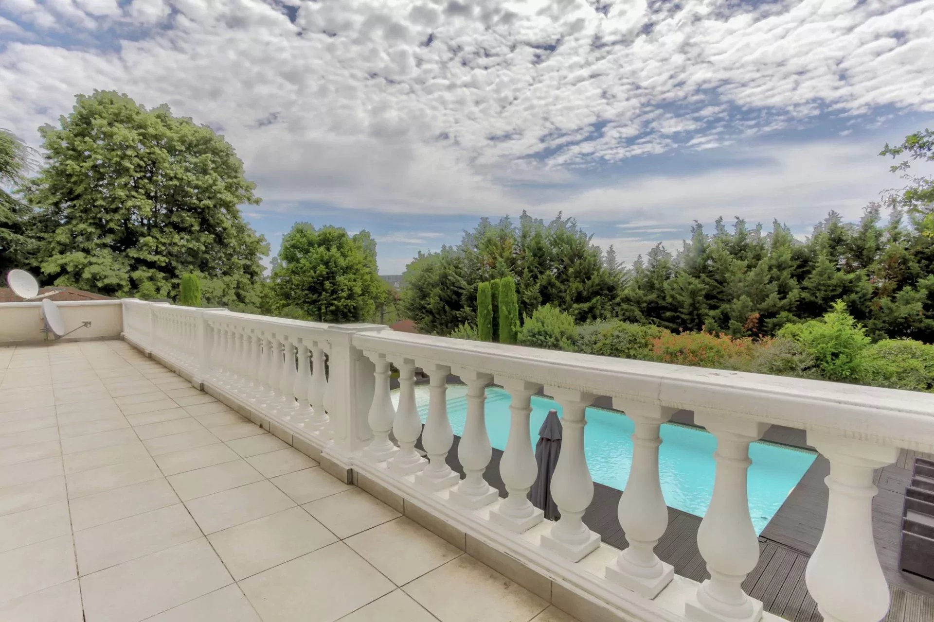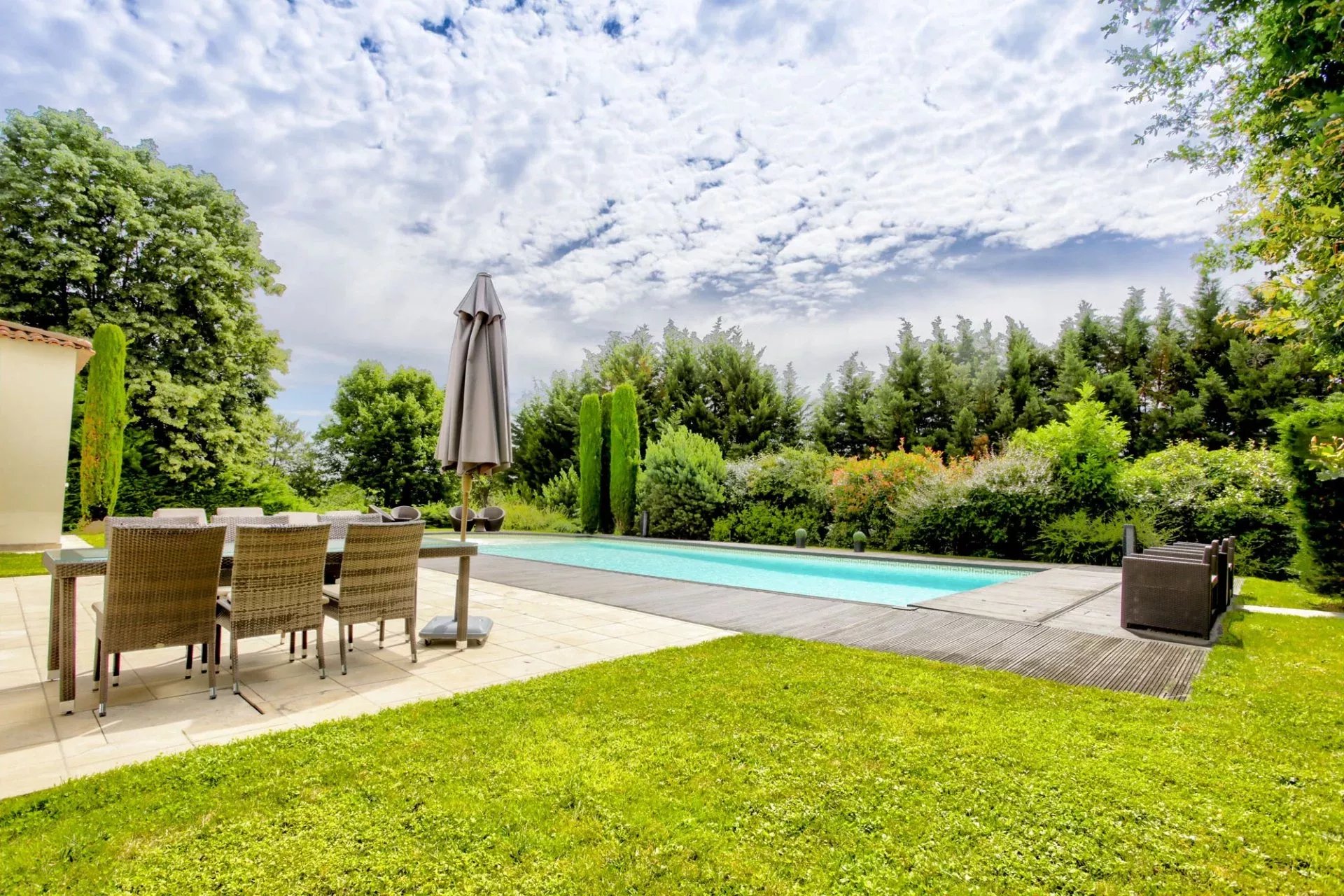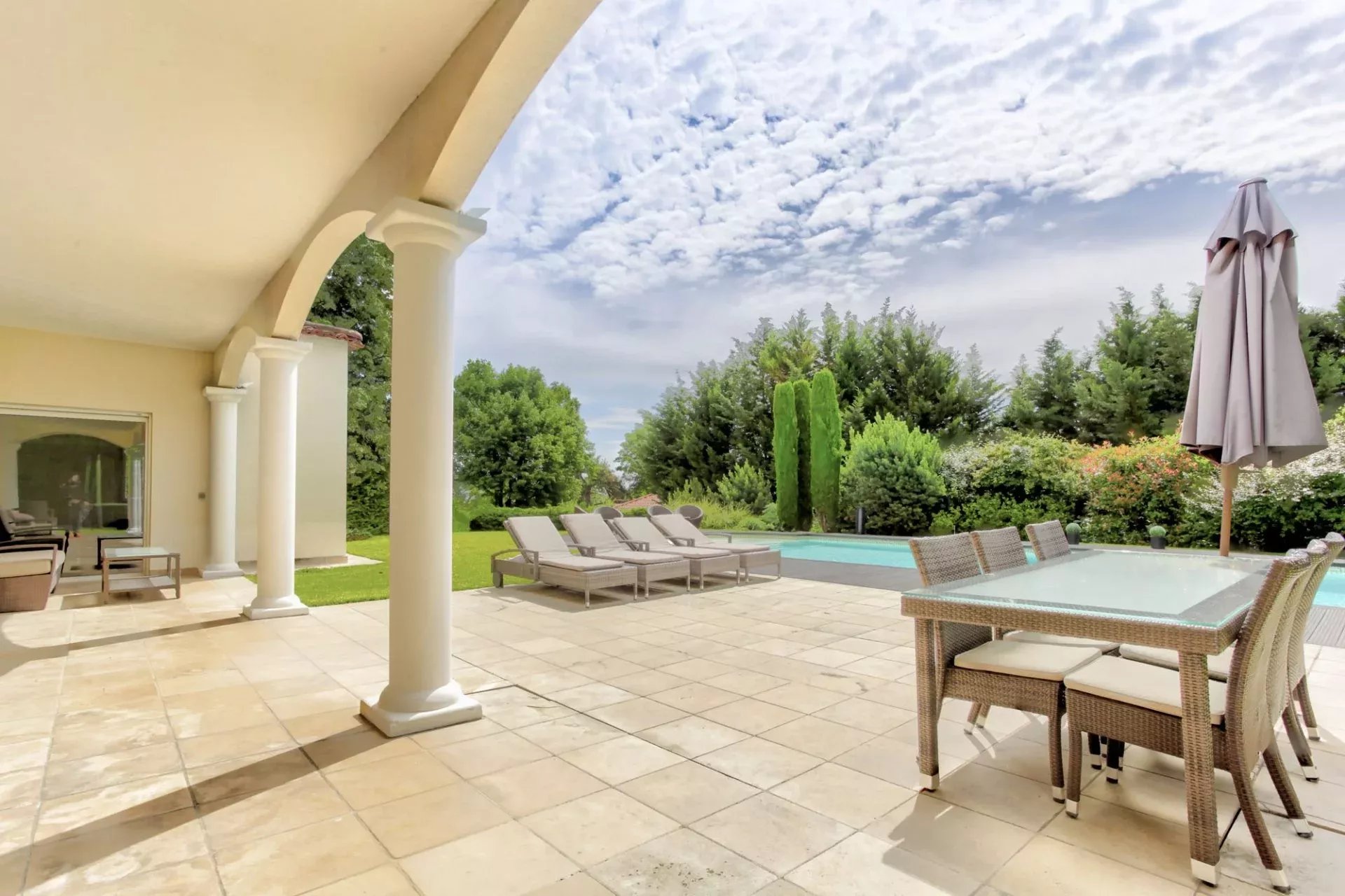 In a peaceful and green setting, away from prying eyes, this magnificent property, built in 1995 and meticulously renovated over the years, offers an exceptional living environment. Nestled on a fully enclosed plot of 1,689 m², it captivates with its elegance, generous spaces, and high-end features. On the garden level, the living area is bright and spacious, featuring a refined 40 m² living room that opens onto a large, partially covered terrace. The contemporary, fully equipped kitchen harmoniously integrates with the dining room, creating a warm and inviting space. This floor also includes a pantry and a beautiful suite with its own private shower room, offering both comfort and privacy. Upstairs, a sumptuous 40 m² master suite provides a true haven of serenity, with a bathroom equipped with a shower/steam room, a bathtub, and a double vanity, as well as a spacious, custom-fitted dressing room. The suite opens onto a terrace with unobstructed views. This level also hosts three additional suites, each with its own private shower room, two of which have direct access to the terrace, further enhancing the sense of space and harmony. The entire house is designed for optimal comfort, featuring modern amenities and high-quality materials. Underfloor heating, present on all three levels and powered by a recent Mitsubishi heat pump, ensures outstanding energy efficiency, with a DPE rating of "B" and GES rating of "A." Every room is air-conditioned, pocket glass doors maximize natural light, and motorized roller shutters, controlled by centralized home automation, add a modern touch. A 14.5 x 6-meter heated swimming pool with reinforced PVC coating invites relaxation with its surrounding beaches, while an automatic irrigation system, mechanical ventilation, and an alarm system enhance the comfort and security of this exceptional home. A double garage with an automatic door and four additional parking spaces complete this ideal property. Located close to shops, public transport, and all amenities, this uniquely charming house offers a true haven of peace, perfect for hosting a family or entertaining in an enchanting setting. Let yourself be captivated by this exceptional residence, where every detail has been carefully considered to provide an incomparable quality of life. For a private viewing or more information, please contact Cécile de Jouffrey at +33 6 85 39 23 35. Dear colleagues, if you have a buyer, do not hesitate to get in touch. We offer free property valuations for all our clients in Lyon and its surrounding areas, so feel free to reach out.