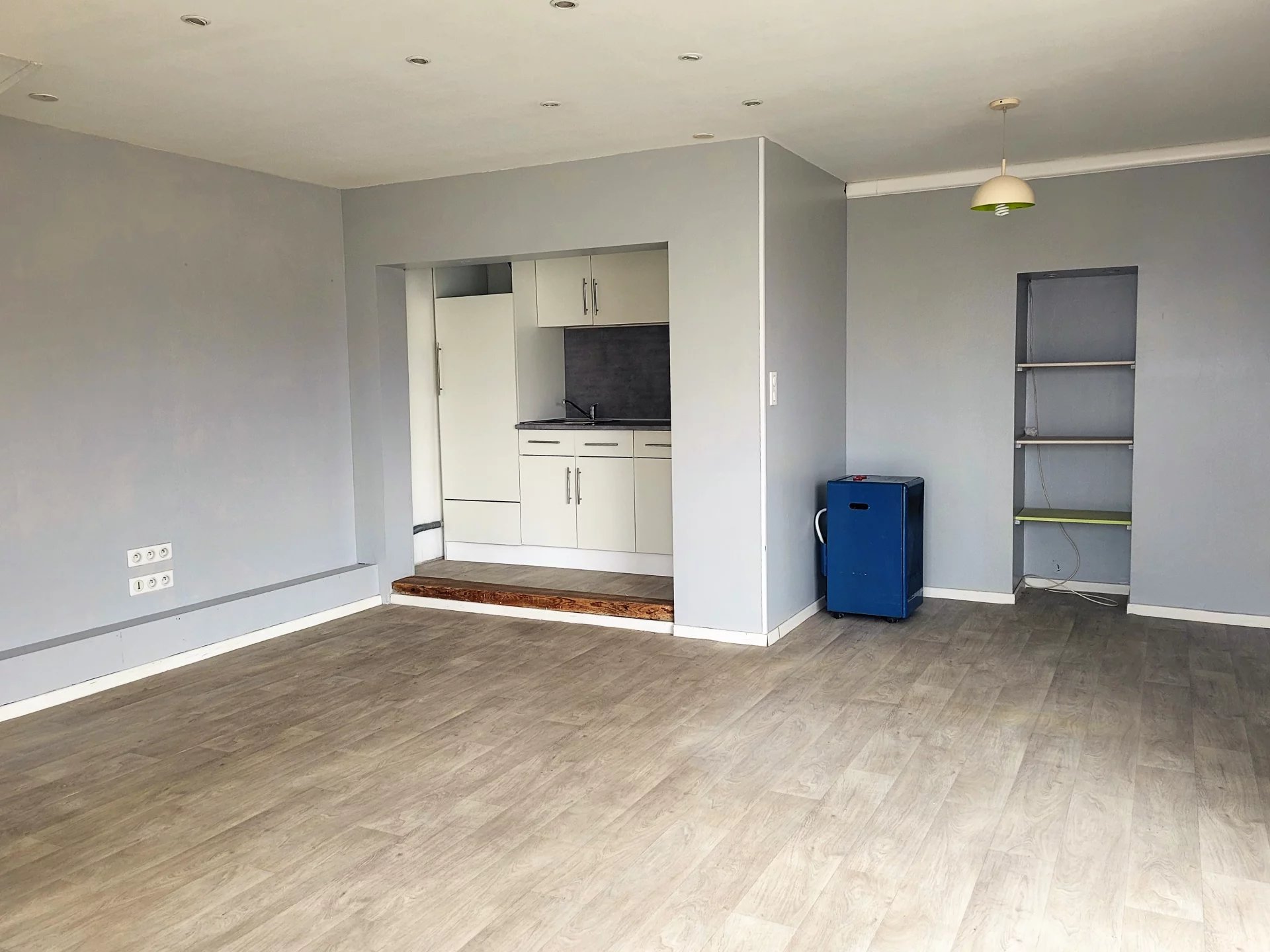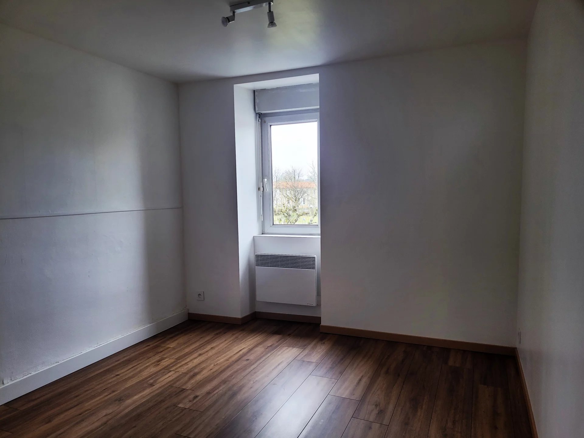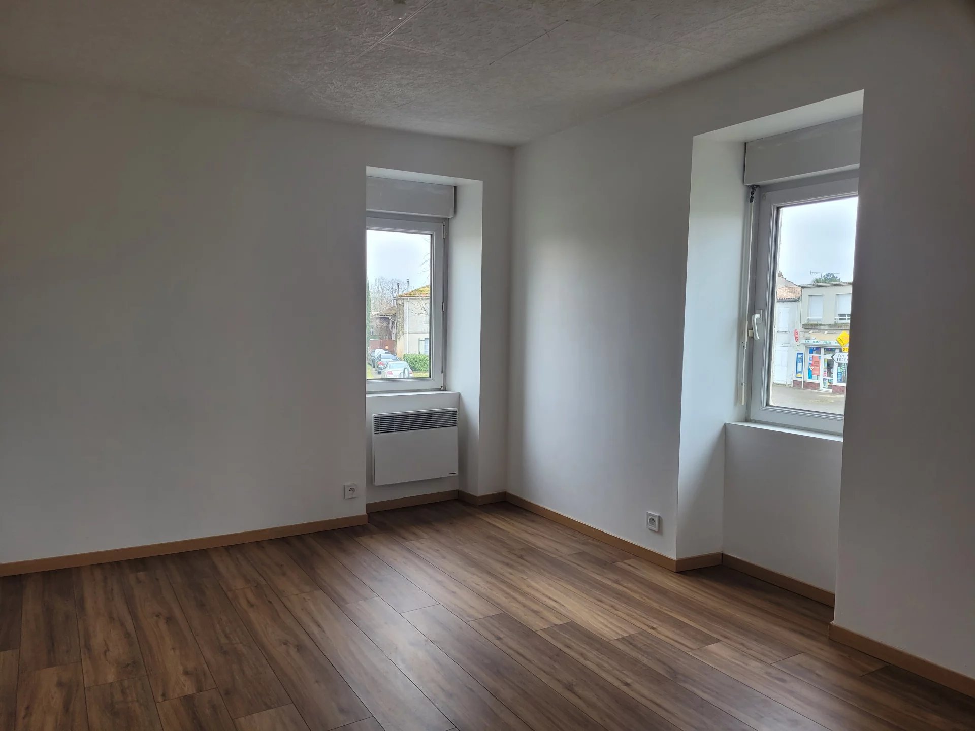 17210 Centre bourg Bussac Forêt, à louer appartement T3 non meublé comprenant au RDC entrée sur la pièce de vie et coin cuisine, puis au premier étage, palier, 2 chambres, salle d'eau et WC - Très bon état, chauffage pompe à chaleur , lumineux et propre - libre de suite