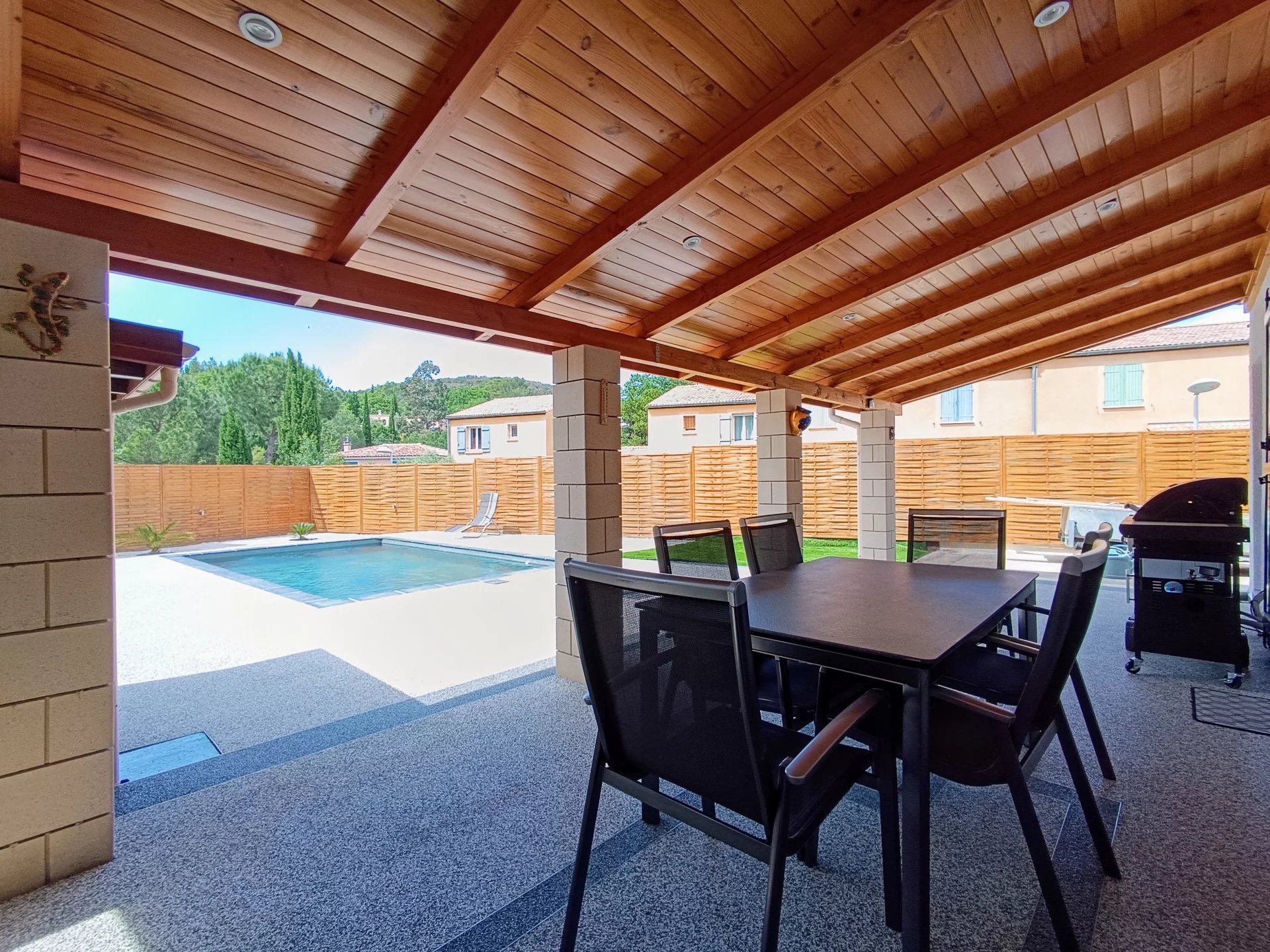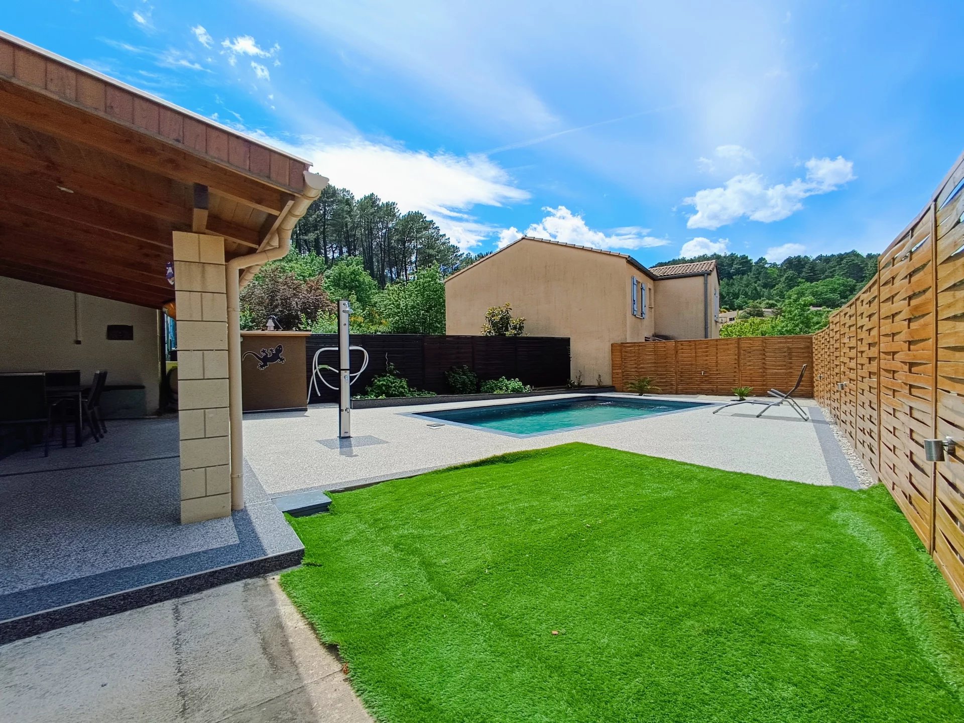 Discover this charming 93 m² house in the heart of Lodève, offering three comfortable bedrooms and five spacious rooms, ideal for a growing family. The home is thoughtfully designed with double glazing and PVC windows, ensuring energy efficiency and quiet indoor spaces. The cozy living area offers ample space for relaxation and entertaining guests. Outside, enjoy a well-maintained garden enclosed by a secure fence, providing privacy and peace of mind. The highlight of this property is the inviting swimming pool, perfect for cooling off during hot summer days. The outdoor area offers plenty of space for barbecues, play, and relaxation under the sun. Located in the picturesque region of Lodève, this home provides a serene escape while remaining close to local amenities and attractions. Experience the perfect blend of comfort, style, and convenience in this delightful property.