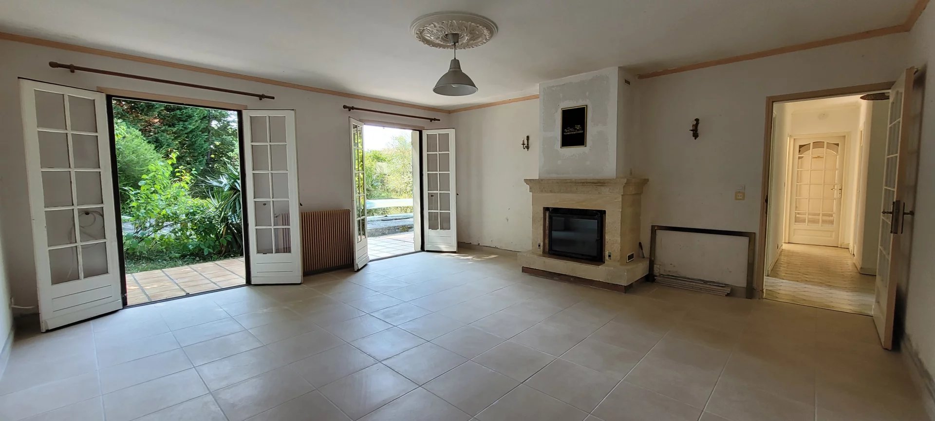 Les volumes sont spacieux, 146m² habitables, 5 chambres, un immense salon avec cheminée insert, une cuisine aménagée et sa cheminée à foyer ouvert, et la lumière pénètre dans toutes les pièces par les larges baies vitrées et grandes fenêtres à double ventaux.