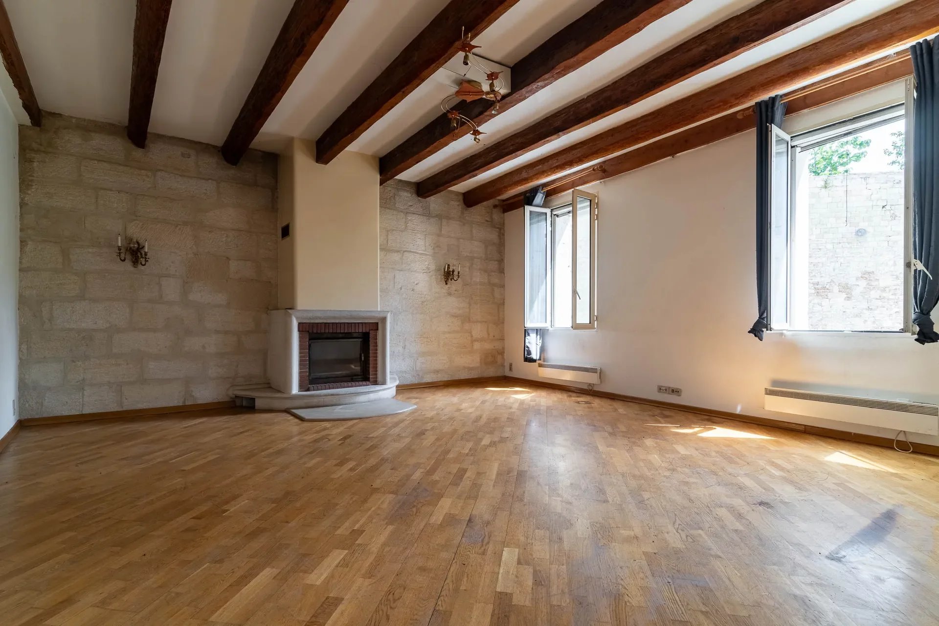 - D’une grande pièce de vie avec poutres apparentes et cheminée