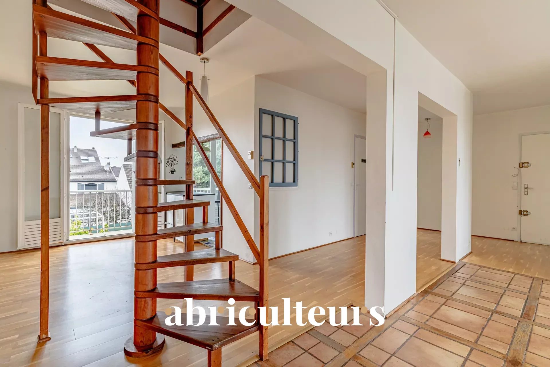 The interior boasts a stylish design with tiled flooring and a striking spiral staircase that adds a unique character to the home. Enjoy the convenience of built-in shelving and a cozy ambiance that makes each room inviting. This apartment provides the perfect blend of functionality and modern aesthetics, catering to the needs of any family or couple.