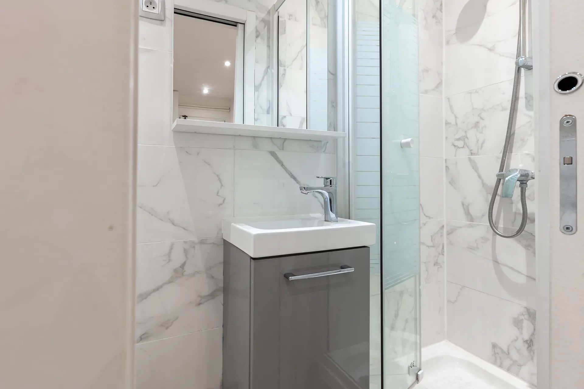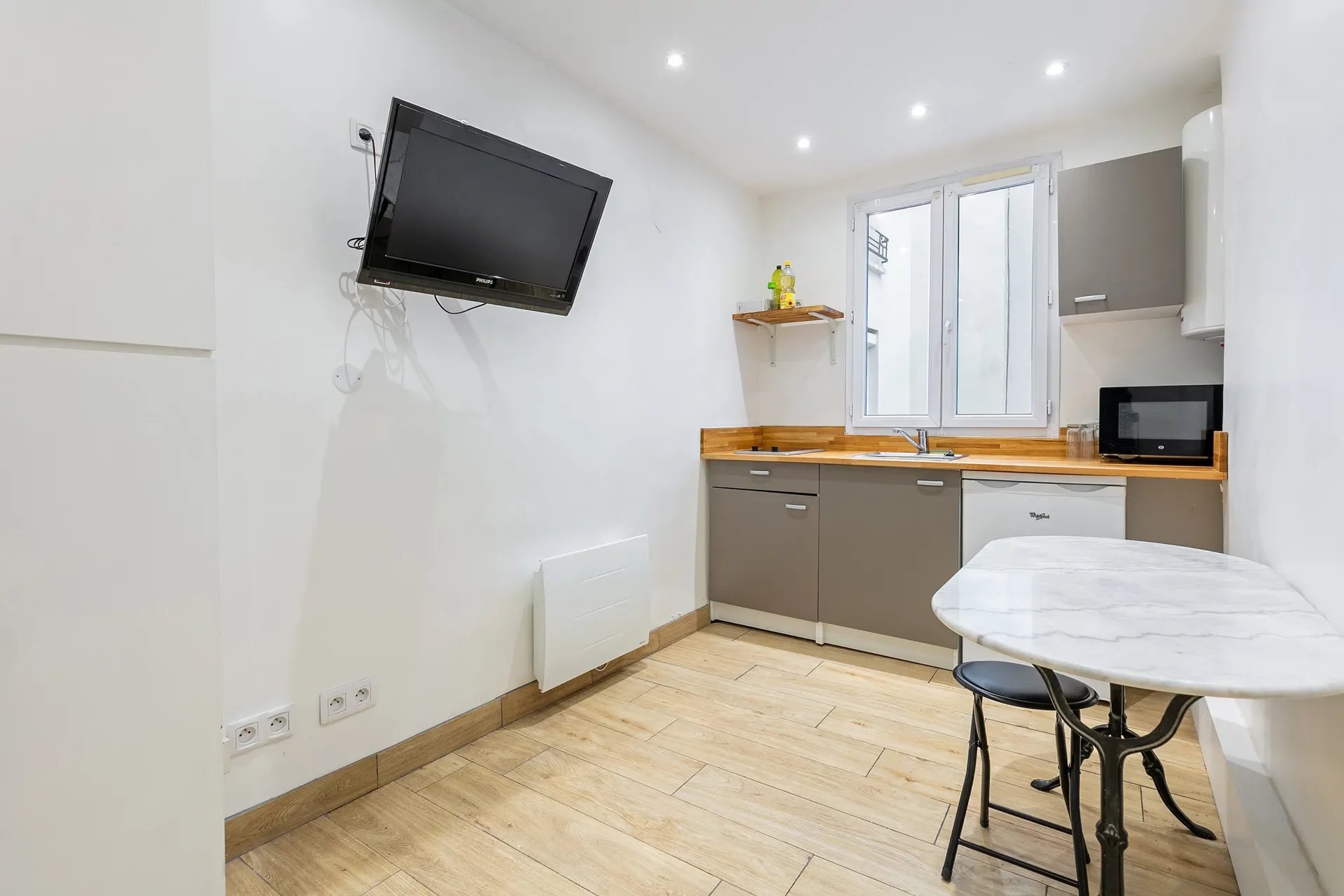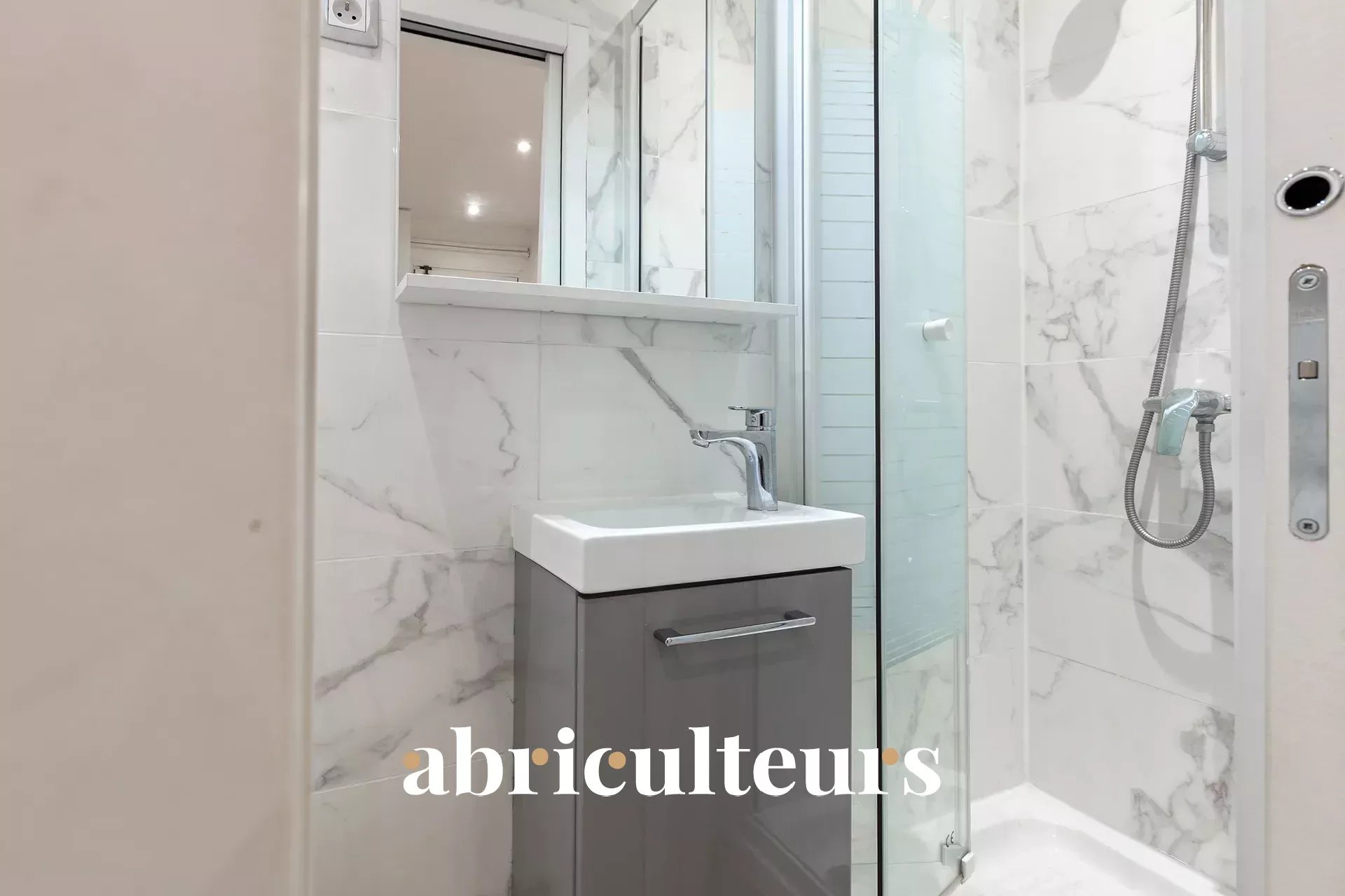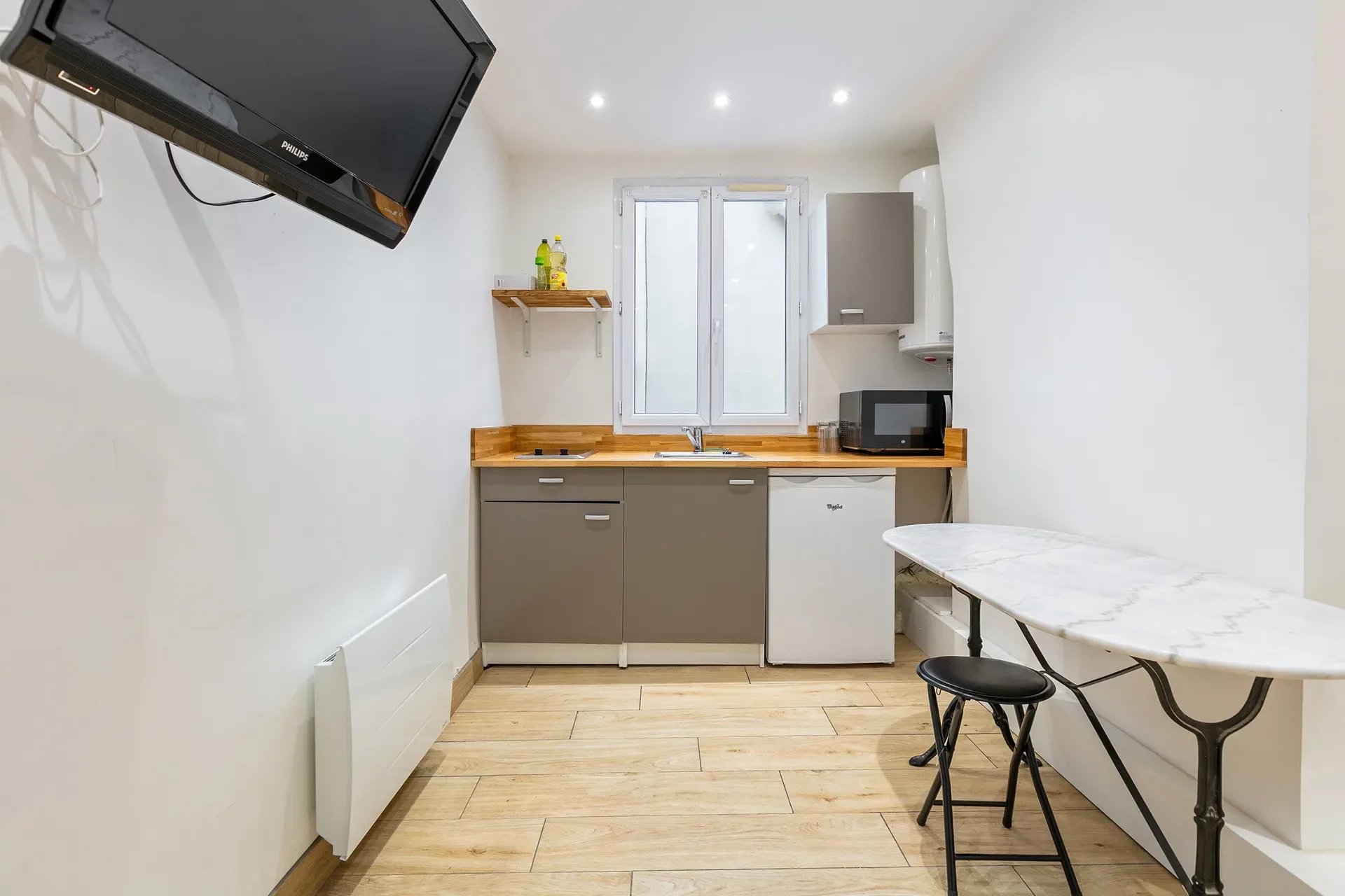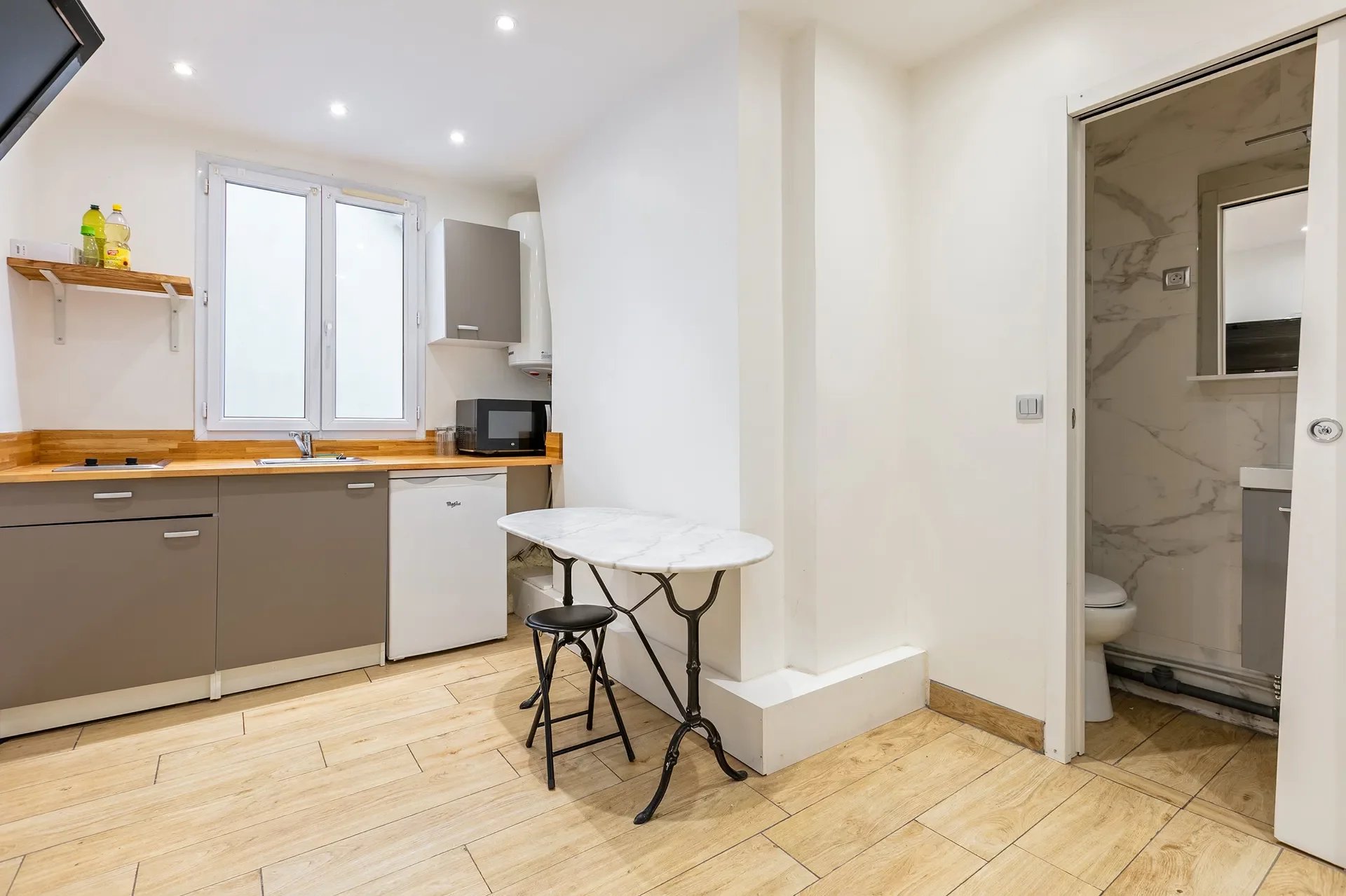 Situé au 3ème étage, il se compose d’une pièce de vie lumineuse avec son espace cuisine et d’une salle d’eau avec douche, vasque et WC (sanibroyeur).