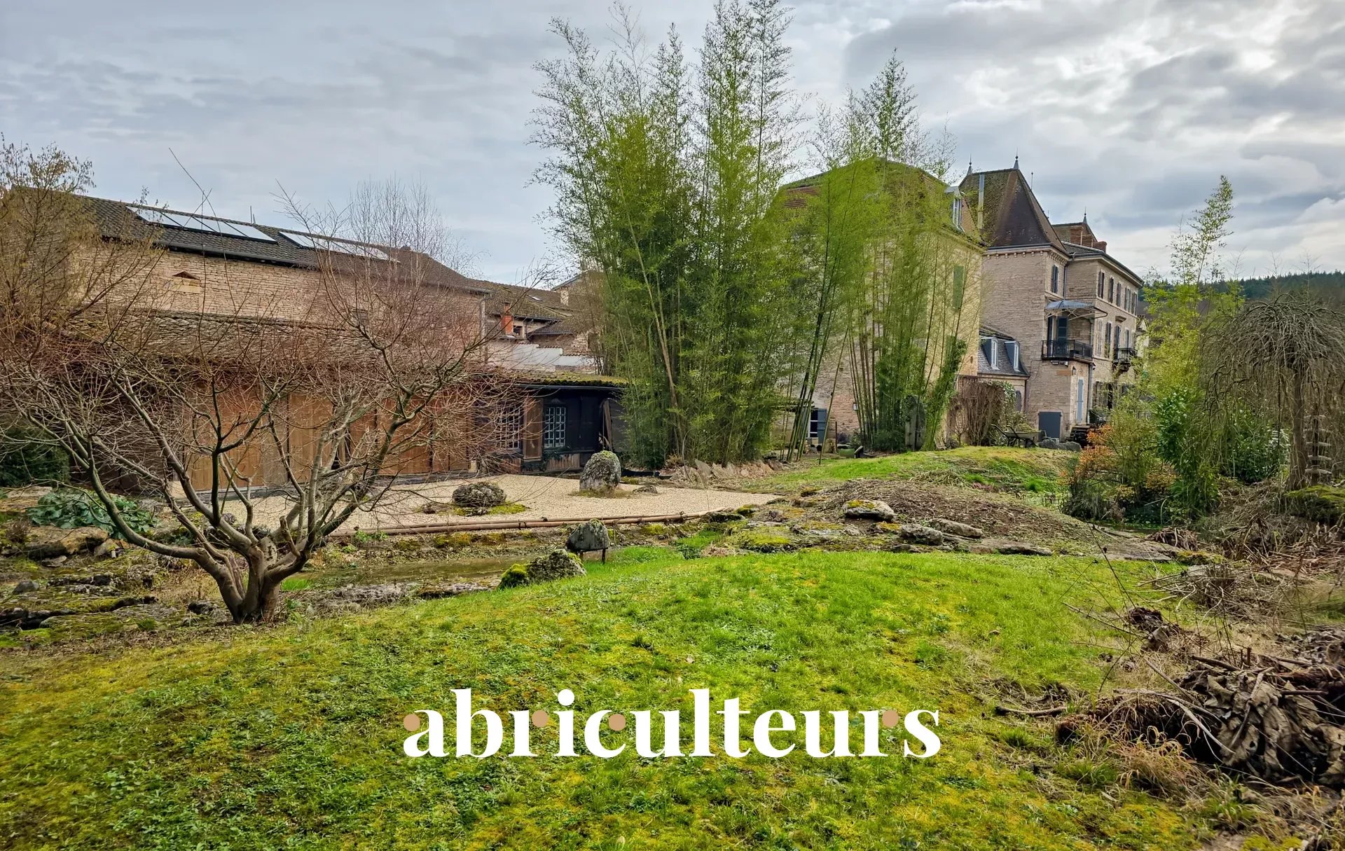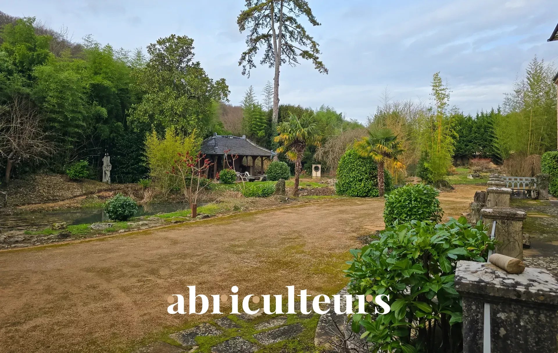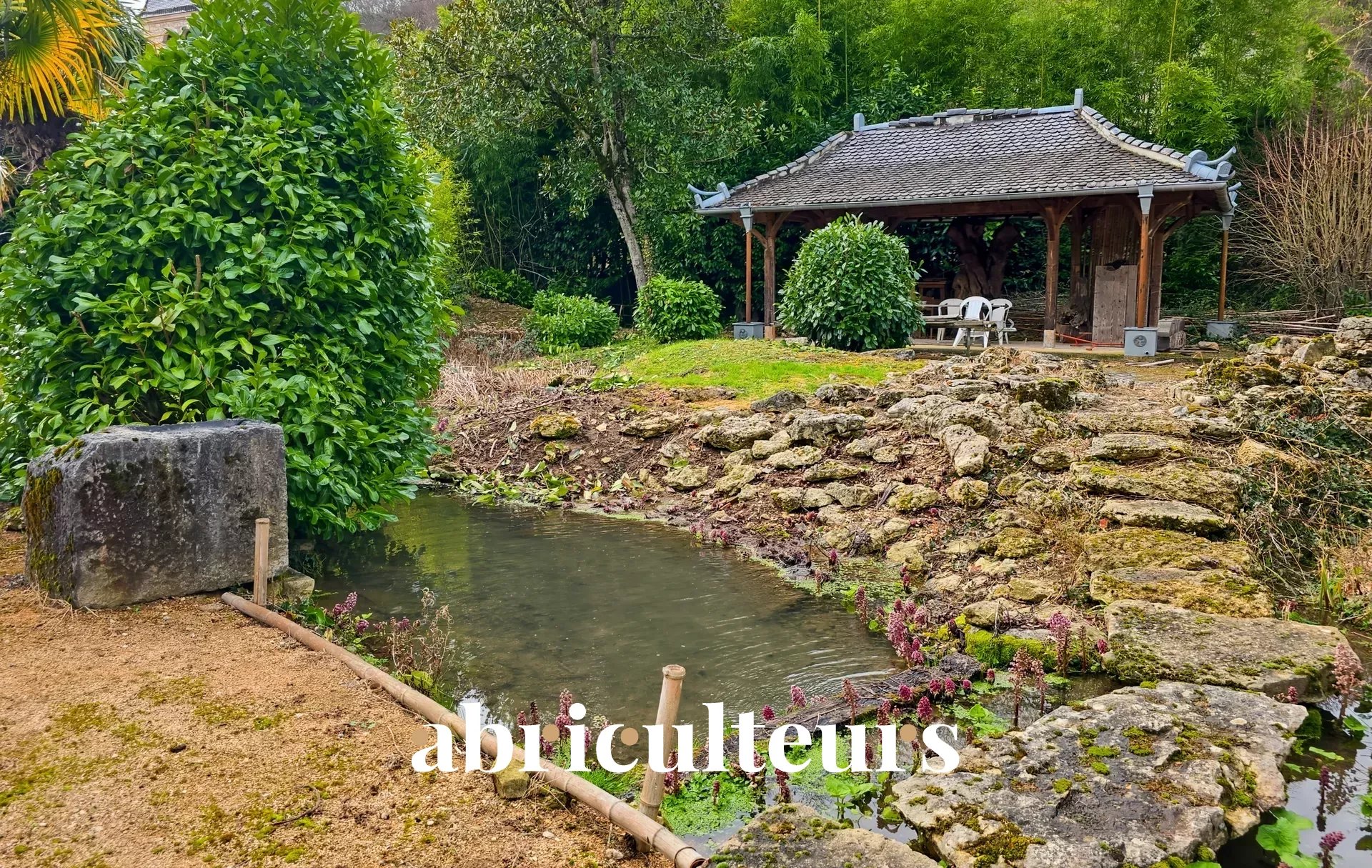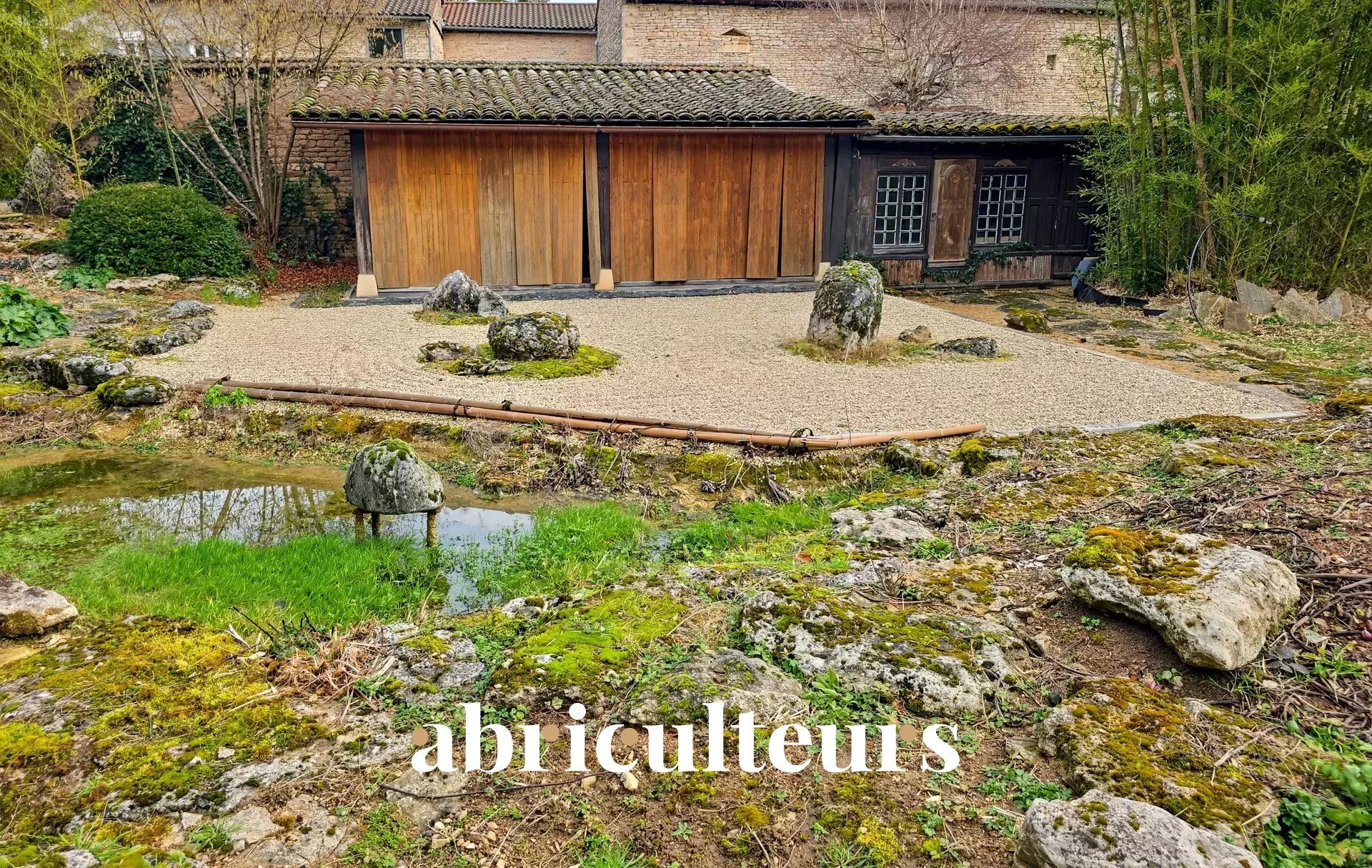 - A magnificent garden with Japanese-style pruned trees and a small ornamental stream running through it