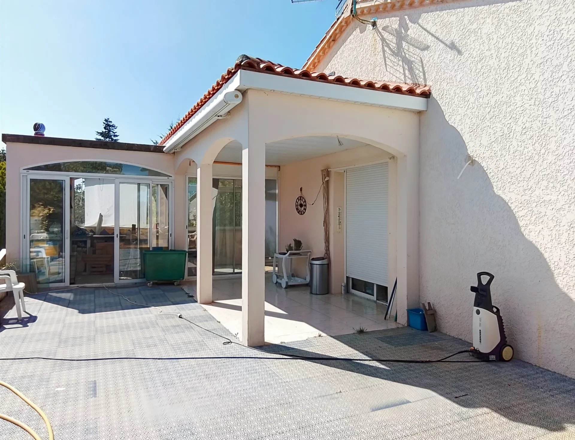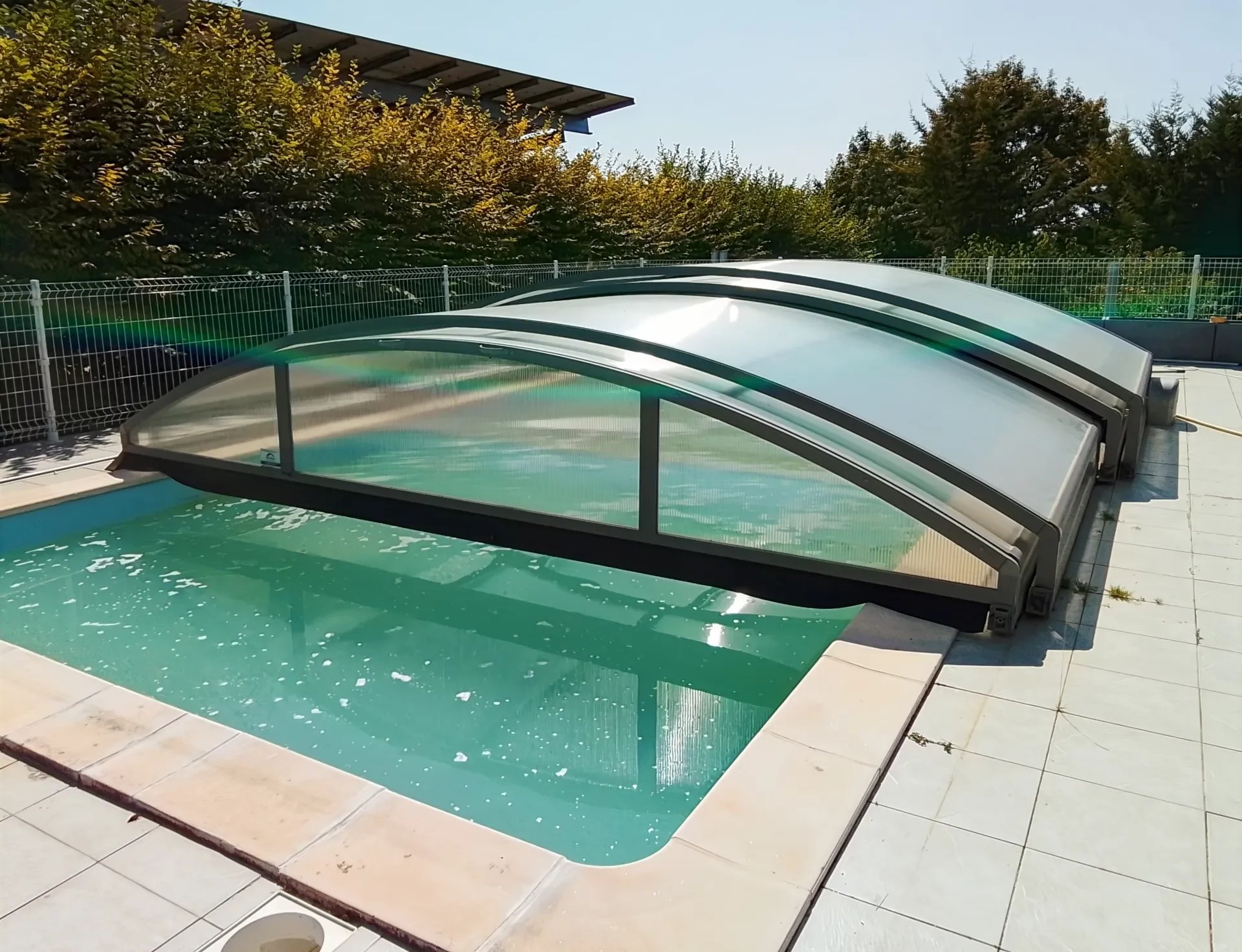 Une piscine de 5 x 10 mètres (profondeur 1,10 m) avec une toiture à fermeture électrique, parfaite pour profiter des journées ensoleillées.