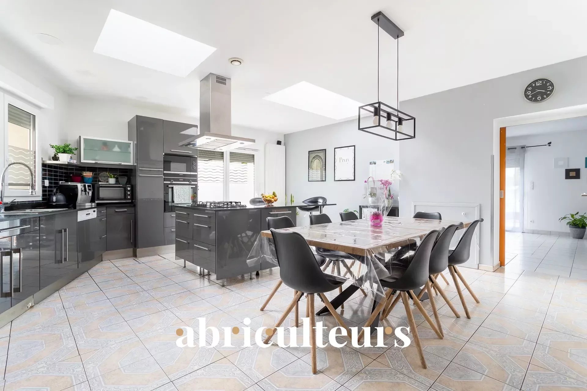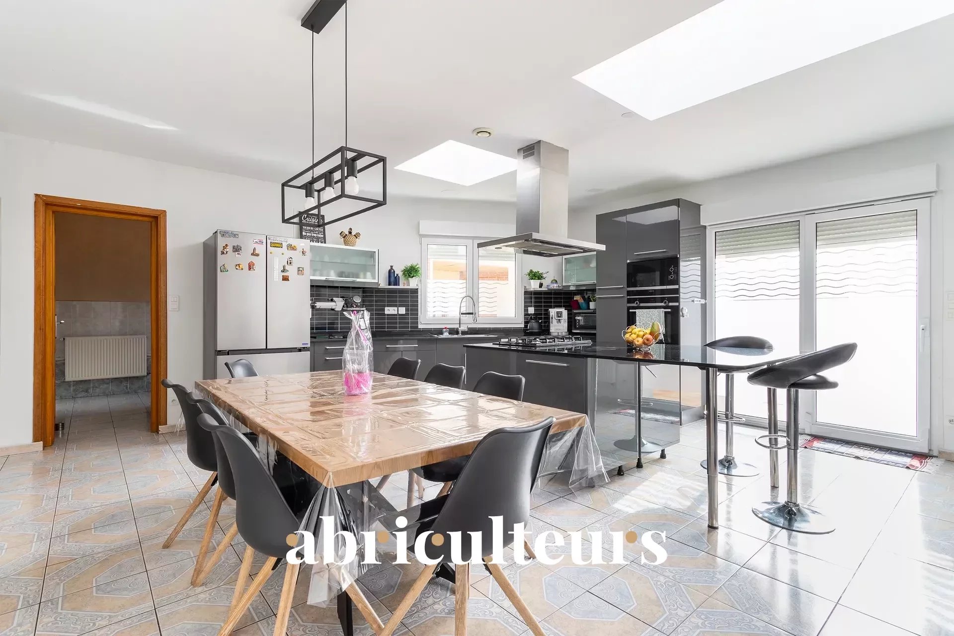 - Une cuisine équipée et ouverte sur une salle à manger