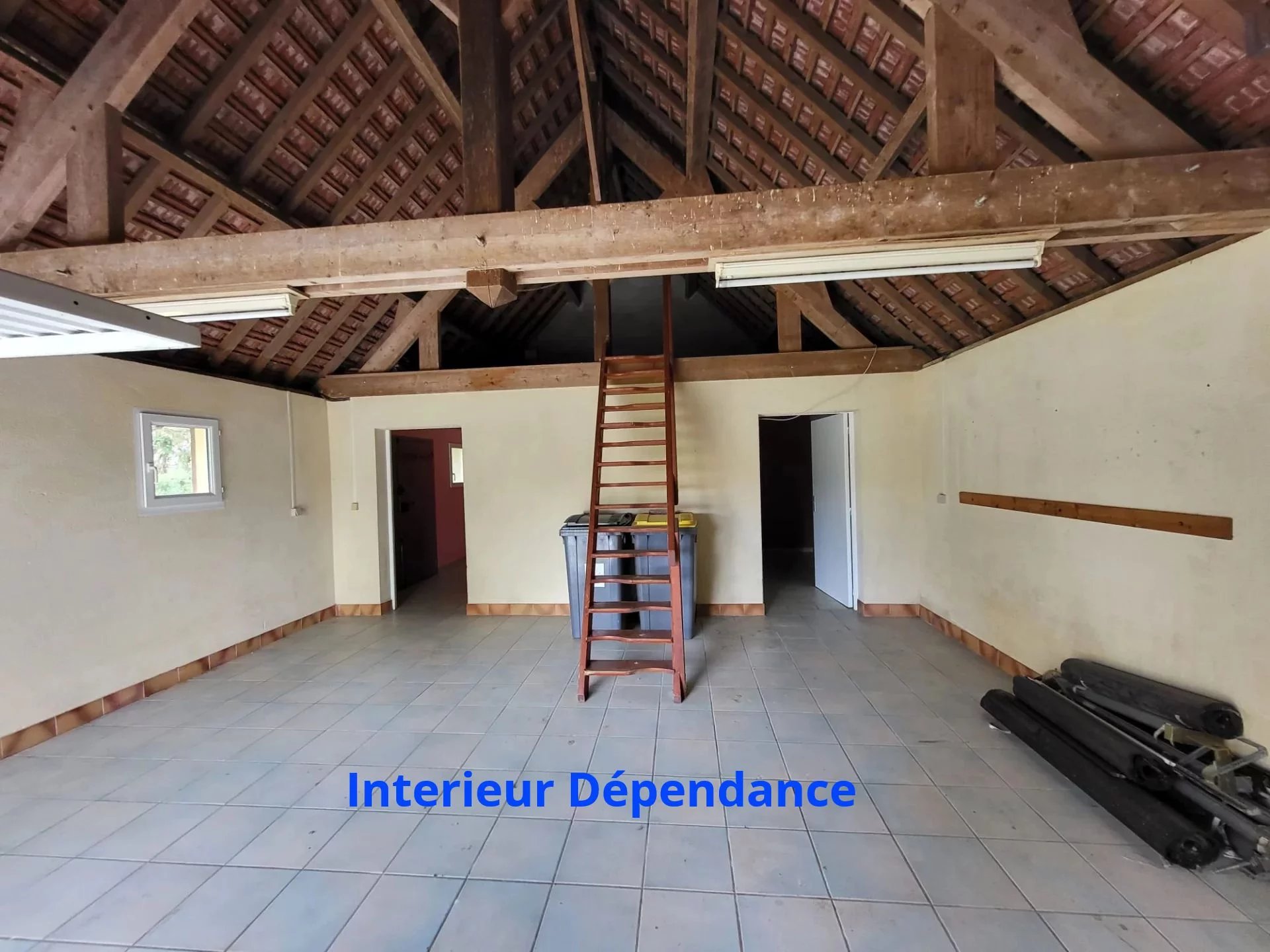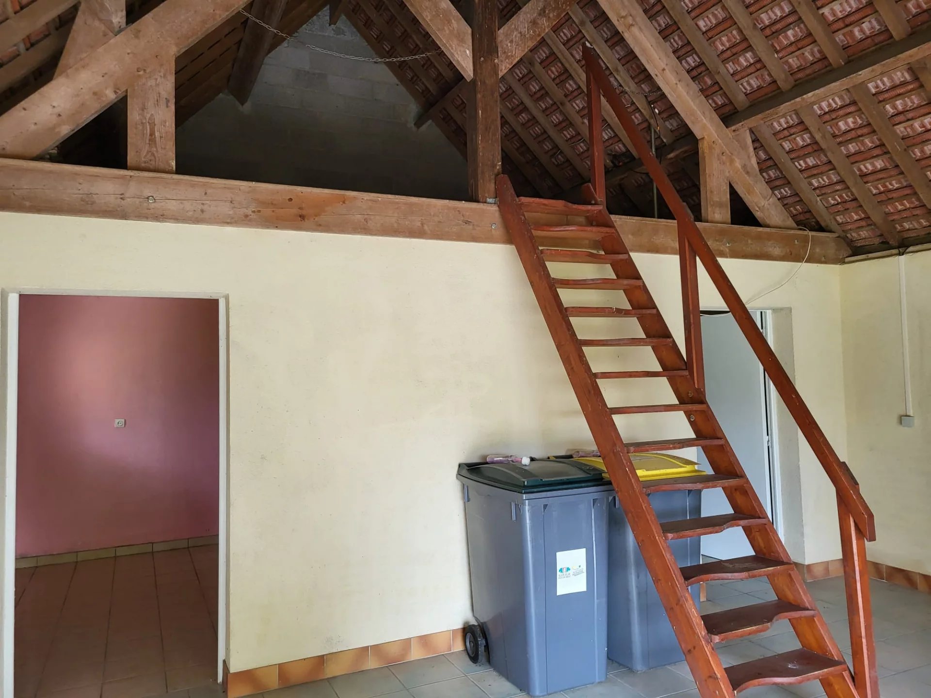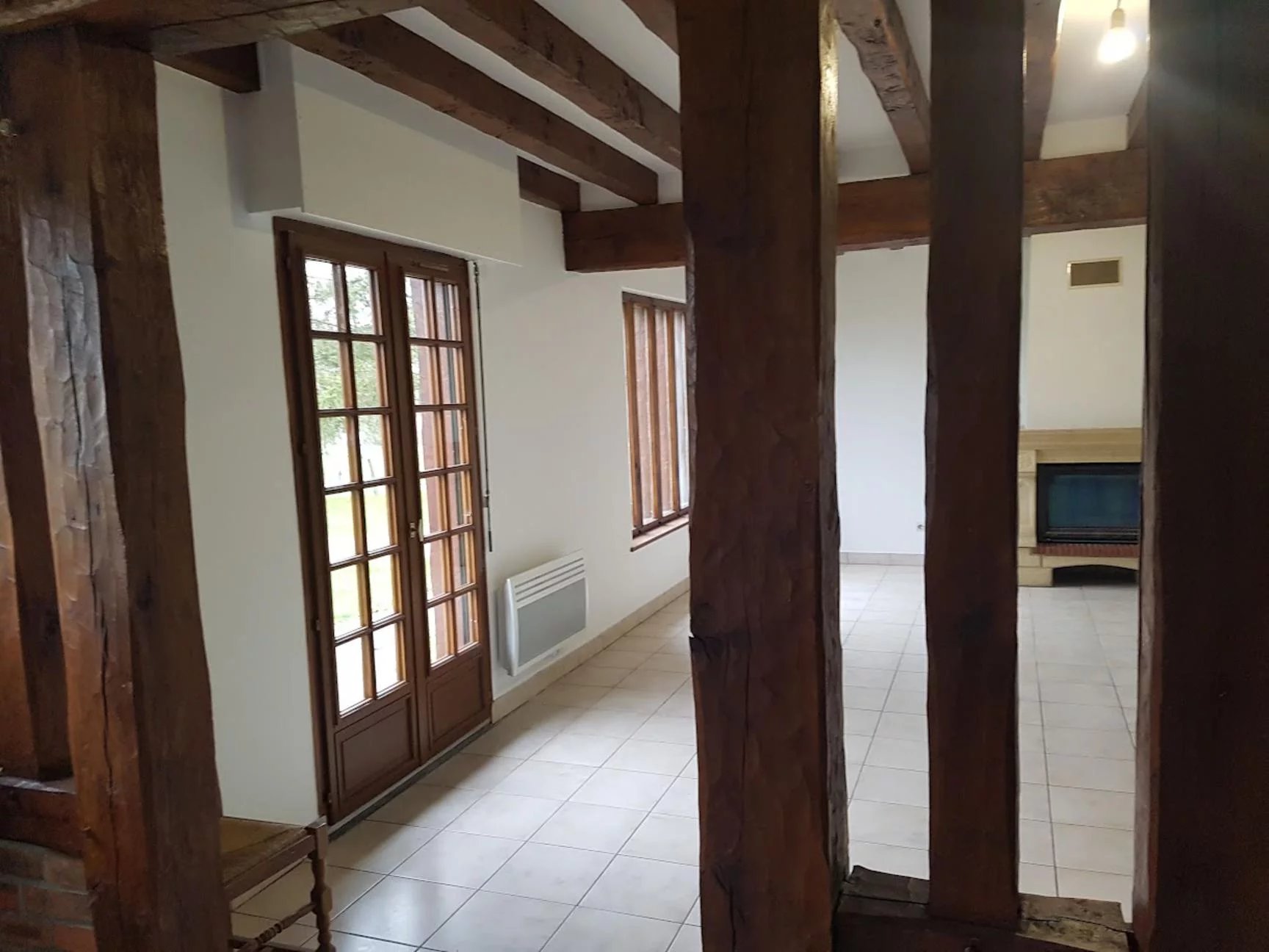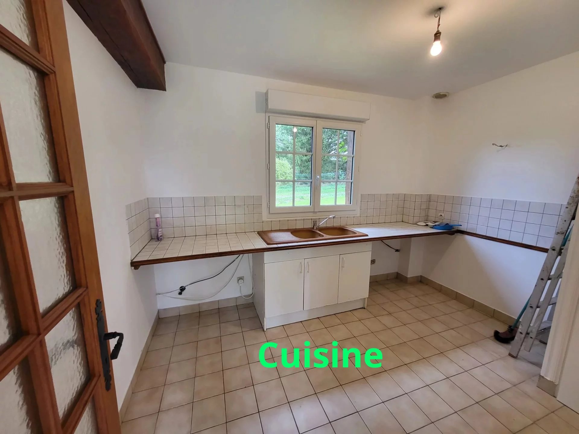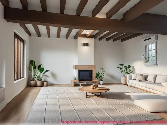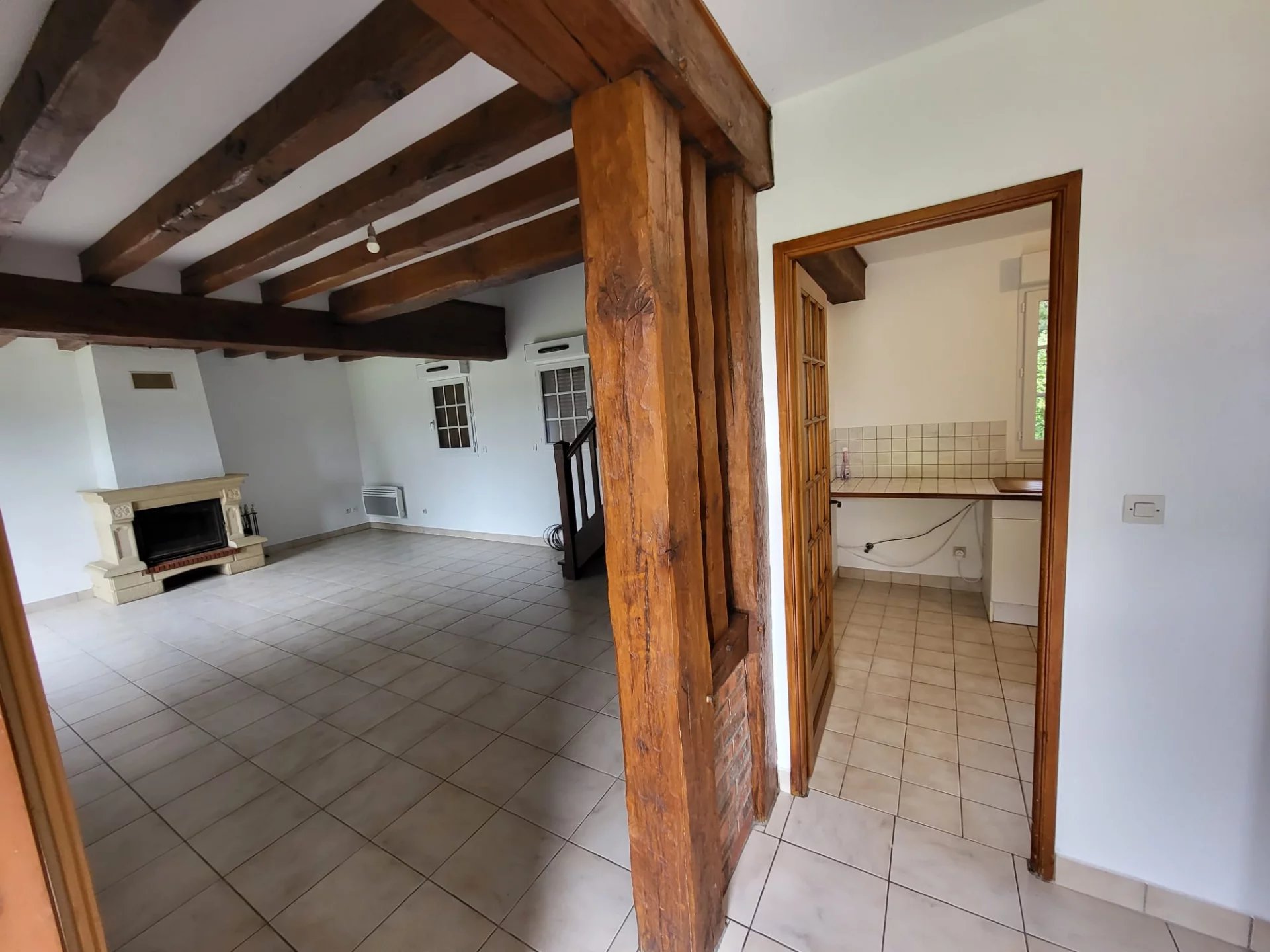 The house is of traditional construction (oak, wattle and daub, tiles) with good insulation and comprises: entrance, living room with fireplace, kitchen, shower room, and WC on the ground floor. Upstairs, there is a hallway, a bedroom with storage, a double bedroom, an office, WC, and a bathroom. Electric shutters are included.