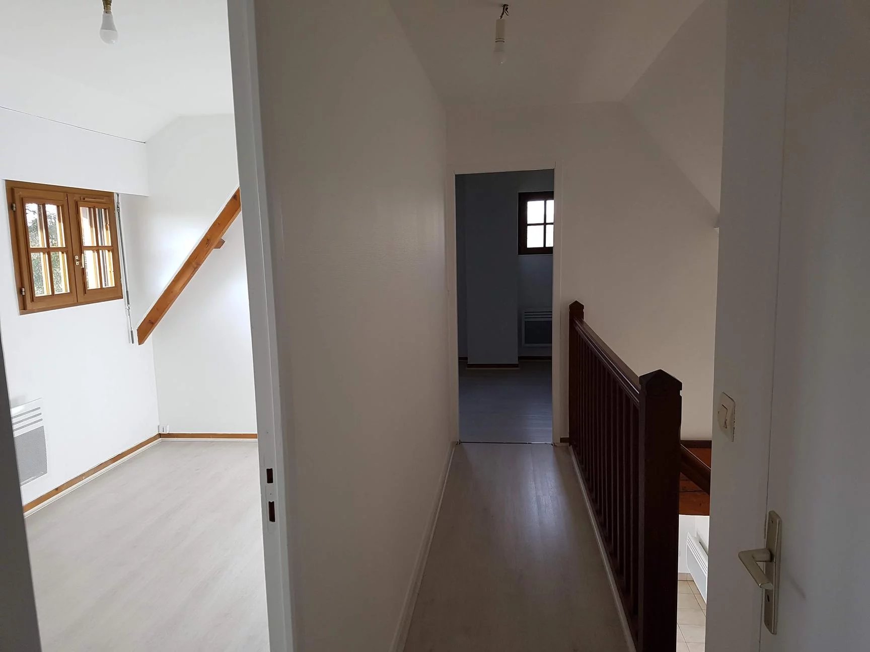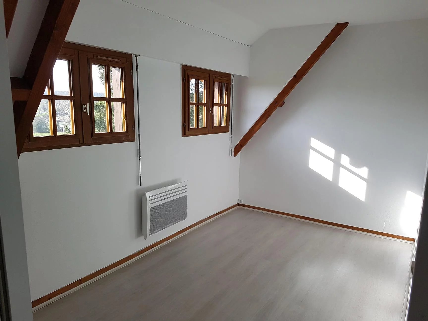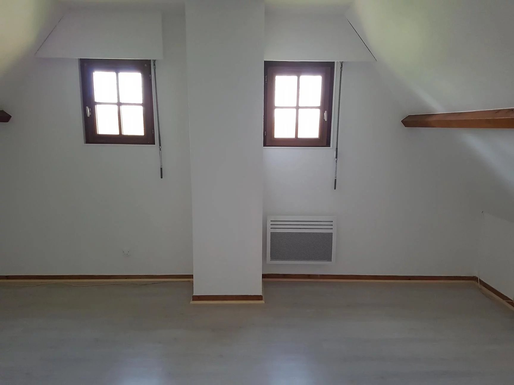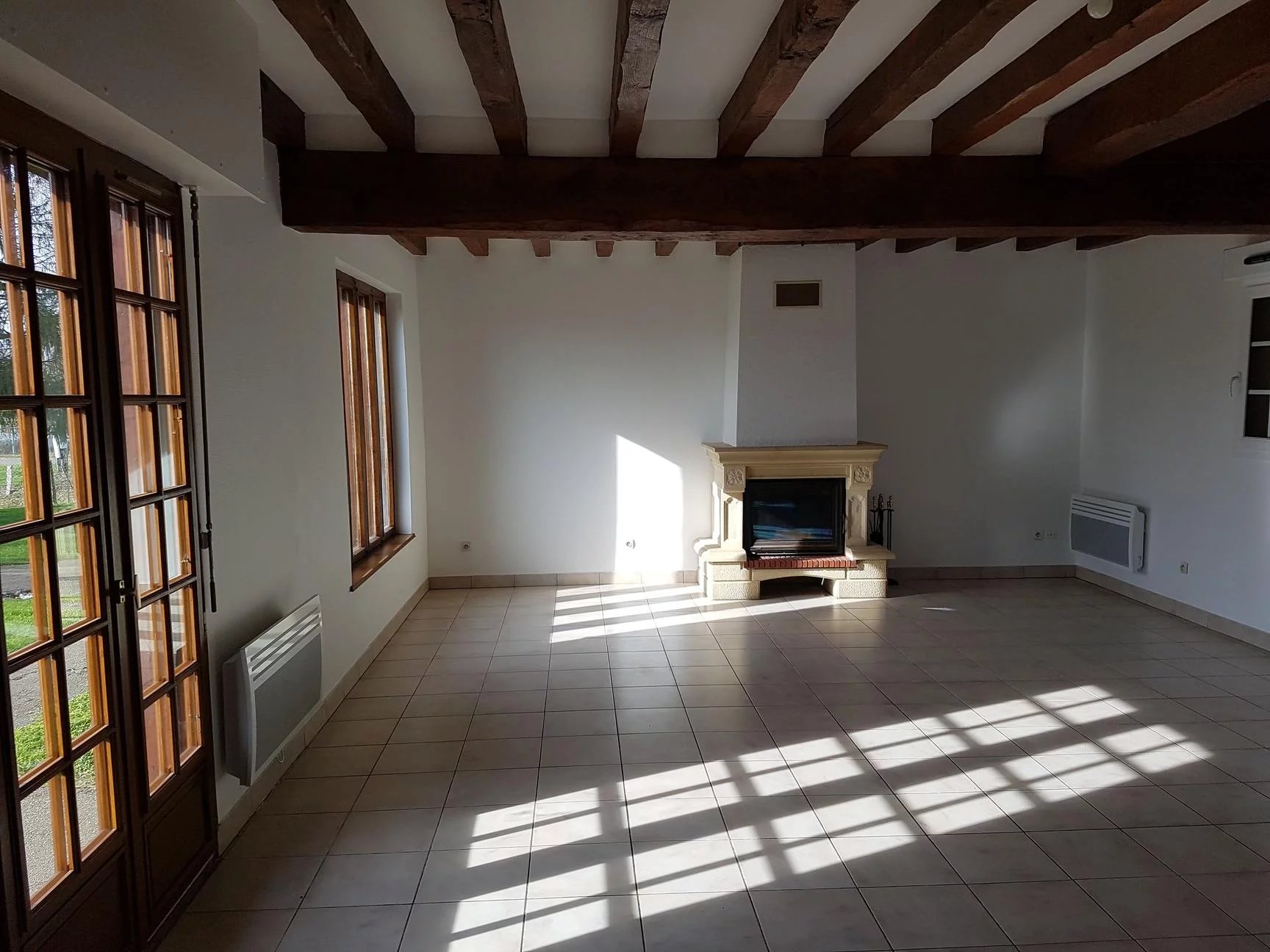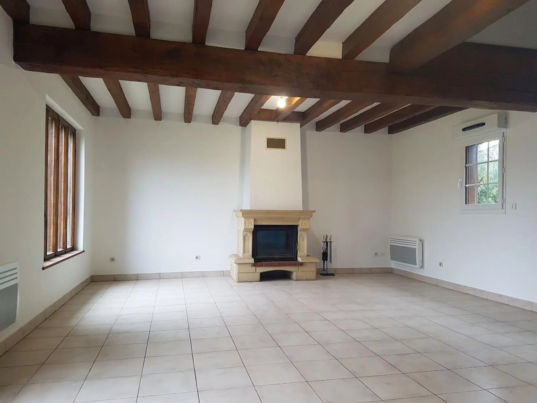 The house is of traditional construction (oak, wattle and daub, tiles) with good insulation and comprises: entrance, living room with fireplace, kitchen, shower room, and WC on the ground floor. Upstairs, there is a hallway, a bedroom with storage, a double bedroom, an office, WC, and a bathroom. Electric shutters are included.