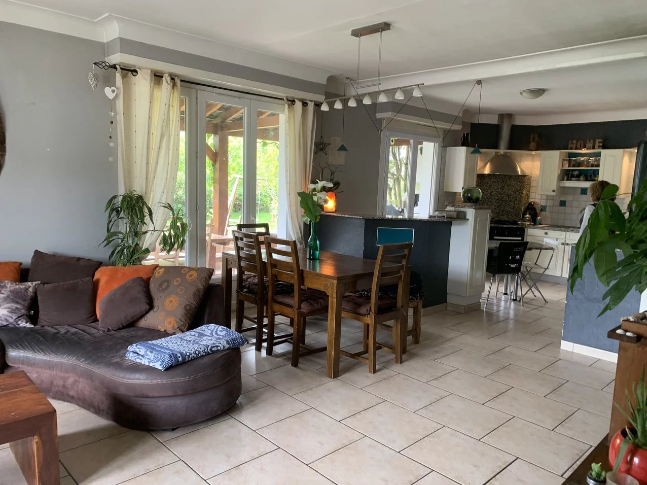 Cuisine ouverte donnant sur une terrasse couverte ; 2 chambres en REZ-DE-CHAUSSÉE et salle de bains.