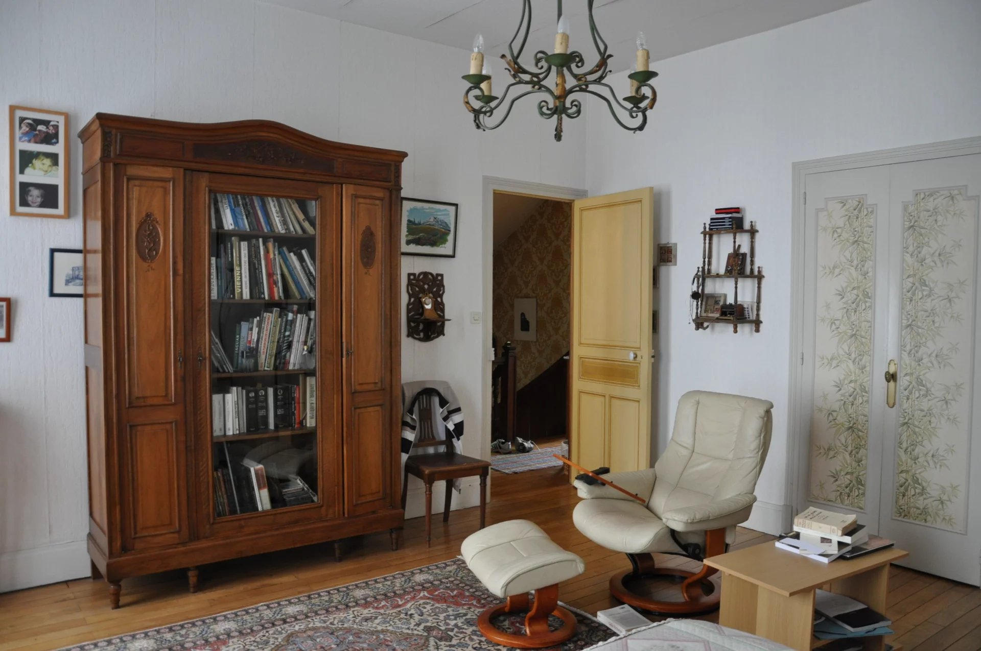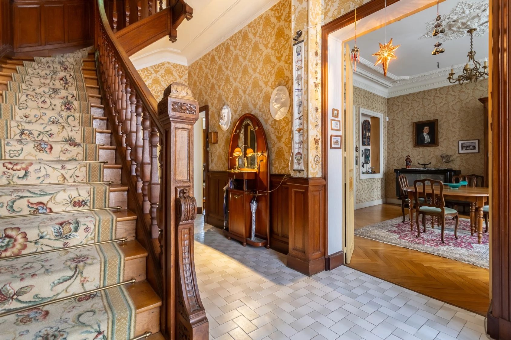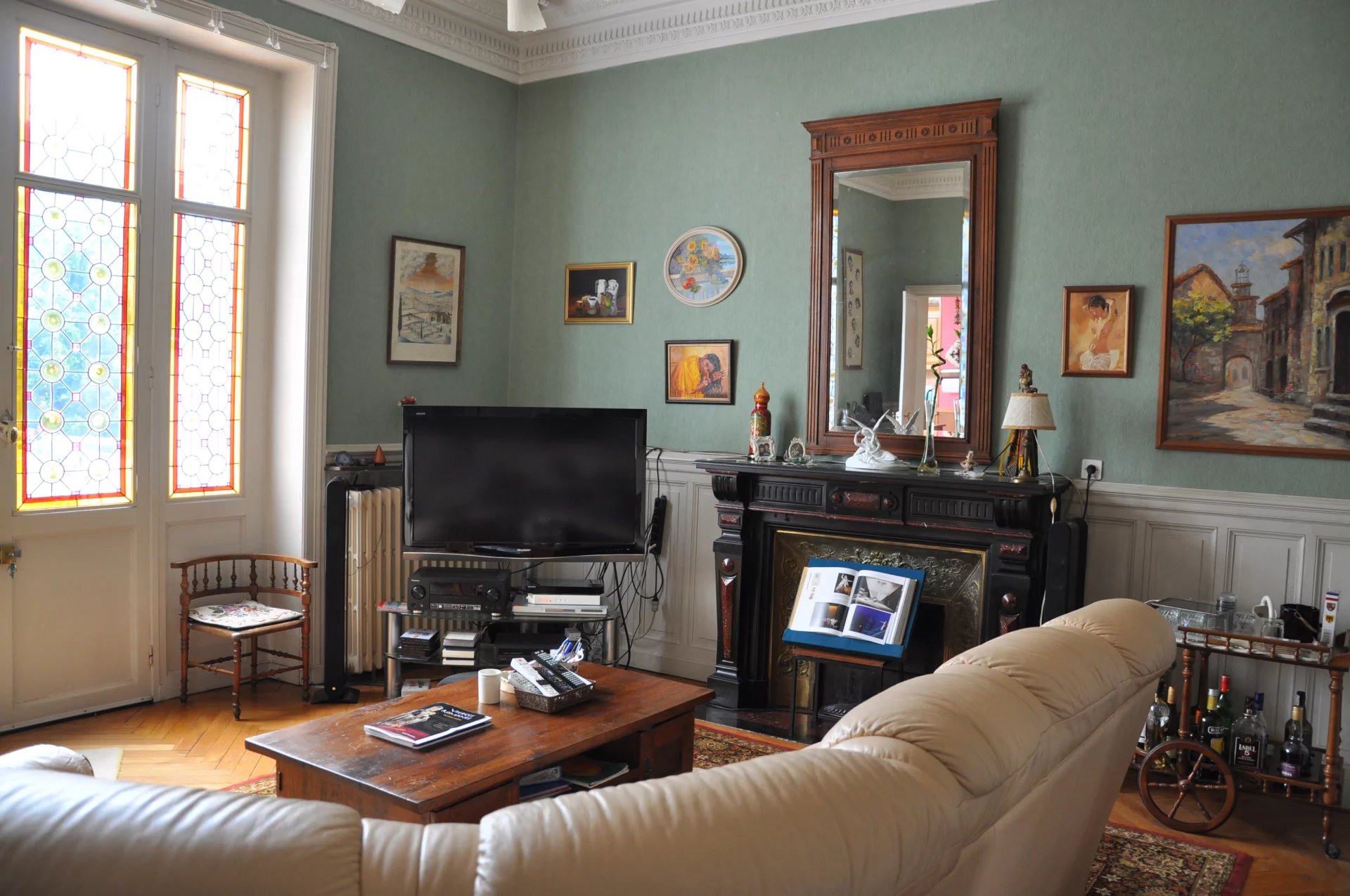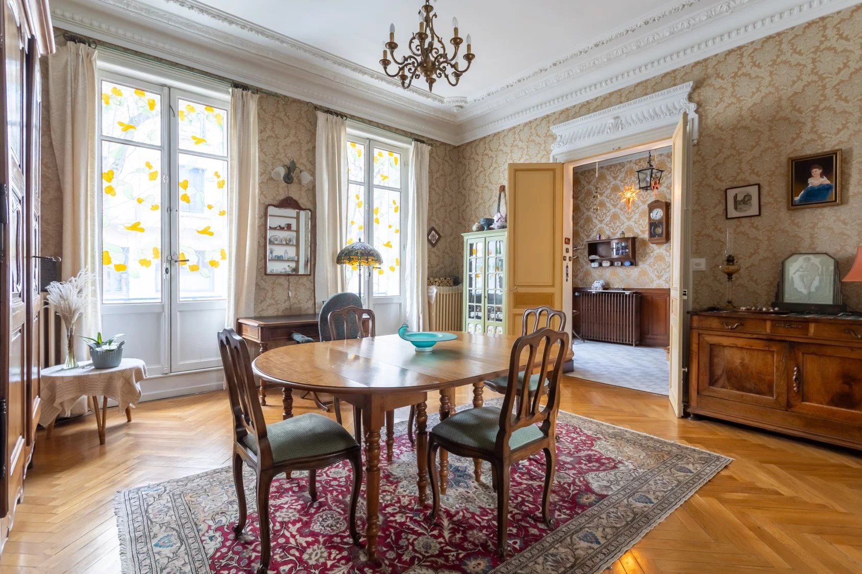 70 m² double reception room, enhanced by period architectural features (moldings, hardwood floors, stained glass windows, and fireplaces), creating an ideal space for entertaining.