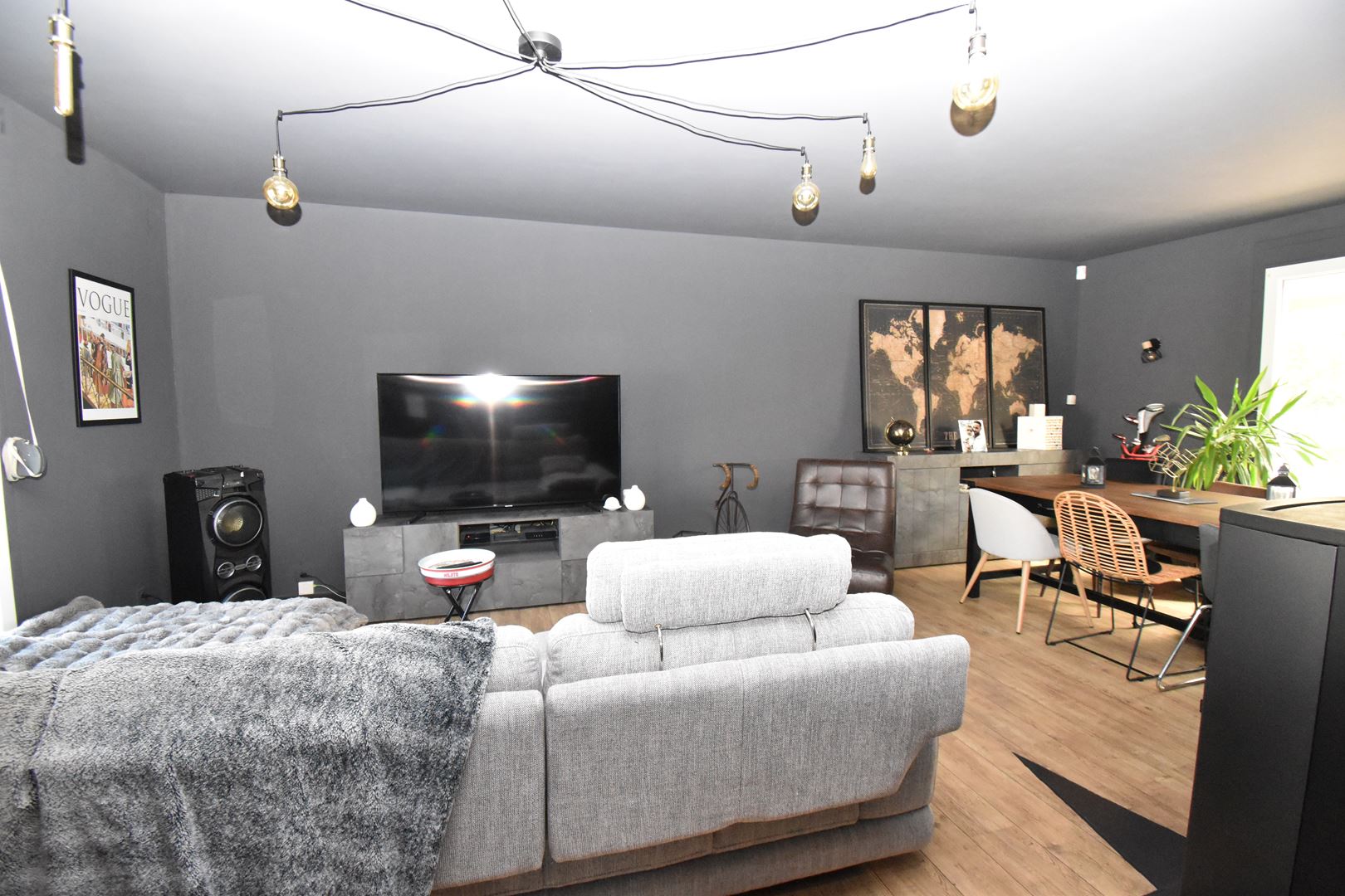 - Hall d'entrée, salon/salle à manger d'environ 28m2 (avec poêle à pellets) ouvert sur une cuisine aménagée d'environ 10m2, salle de douche, 3 chambres d'environ 10m2, lingerie et wc