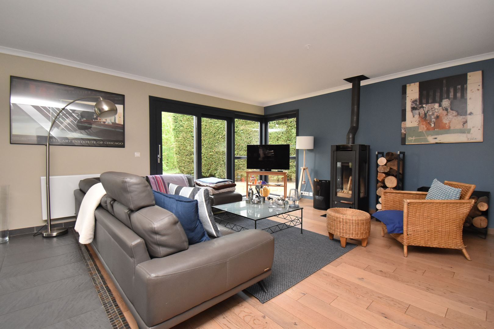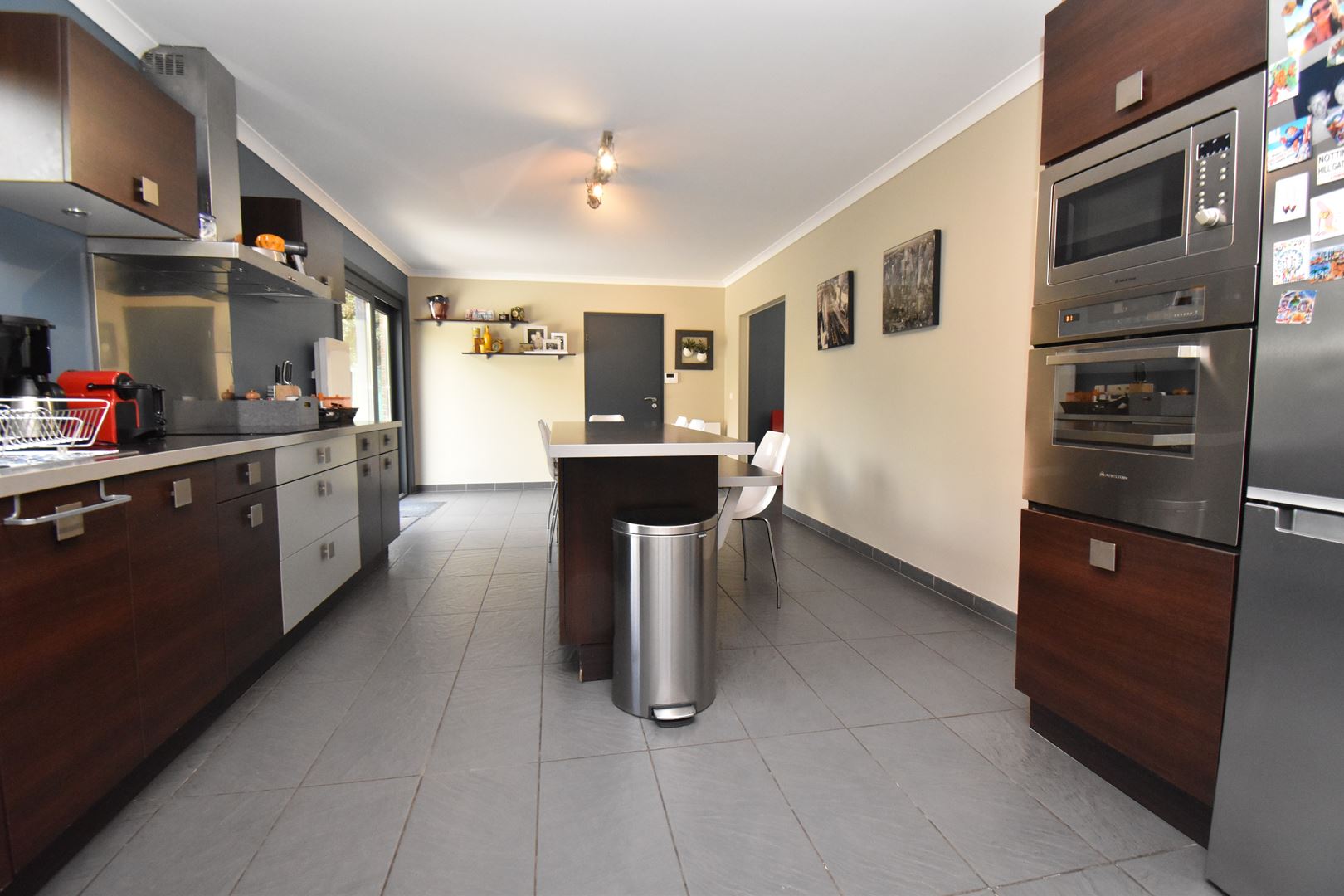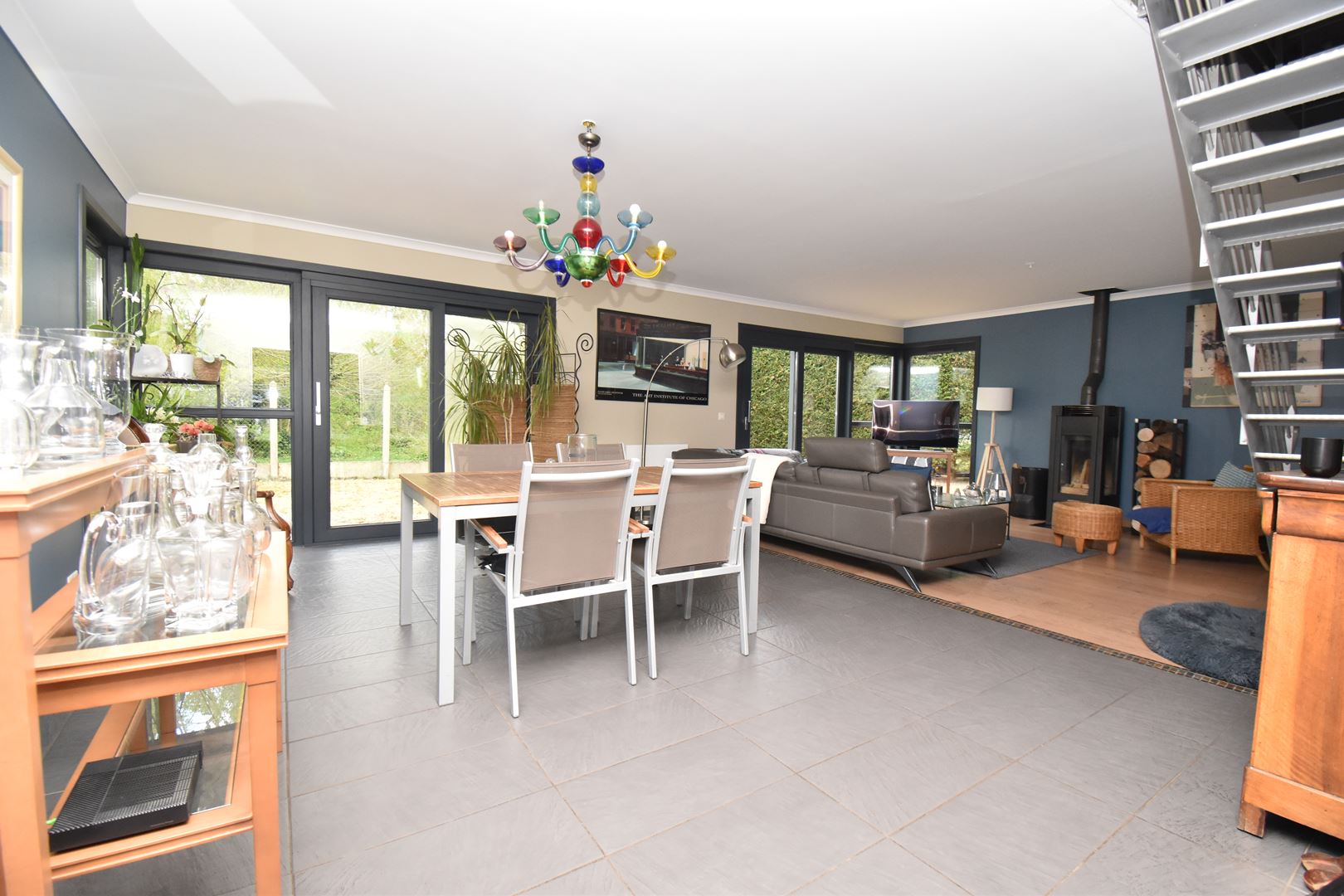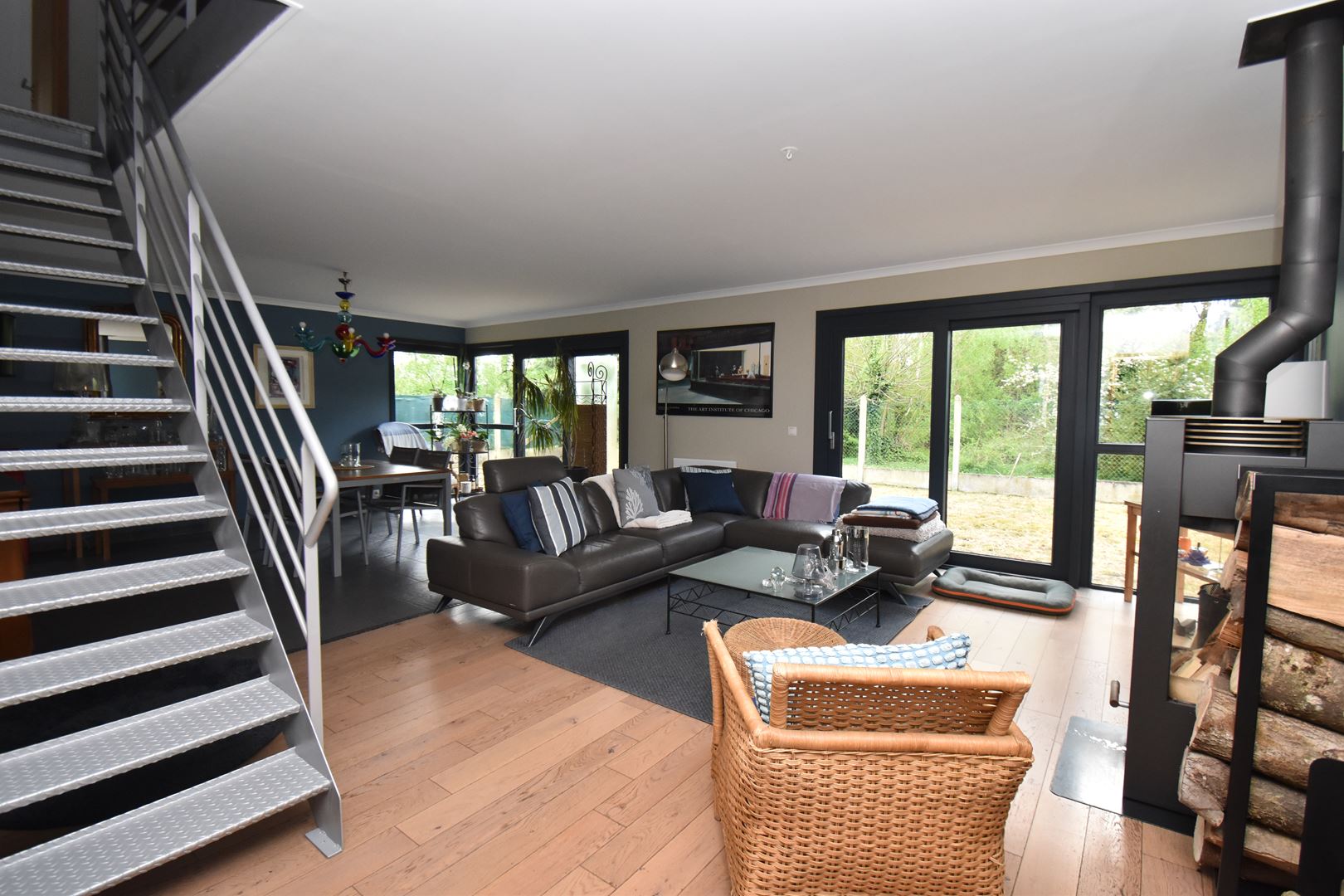 - Rdc : Hall d'entrée avec vestiaire , salon/salle à manger d'environ 45m2 avec poêle à bois , cuisine équipée de 25 m2 avec espace repas, lingerie/cellier , wc